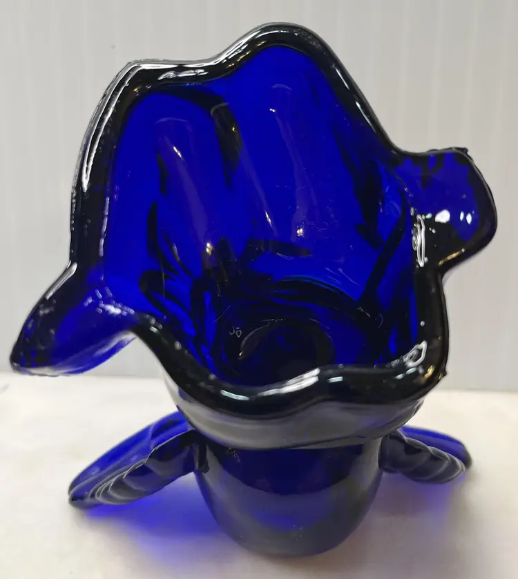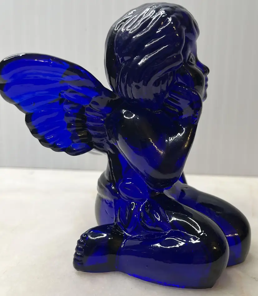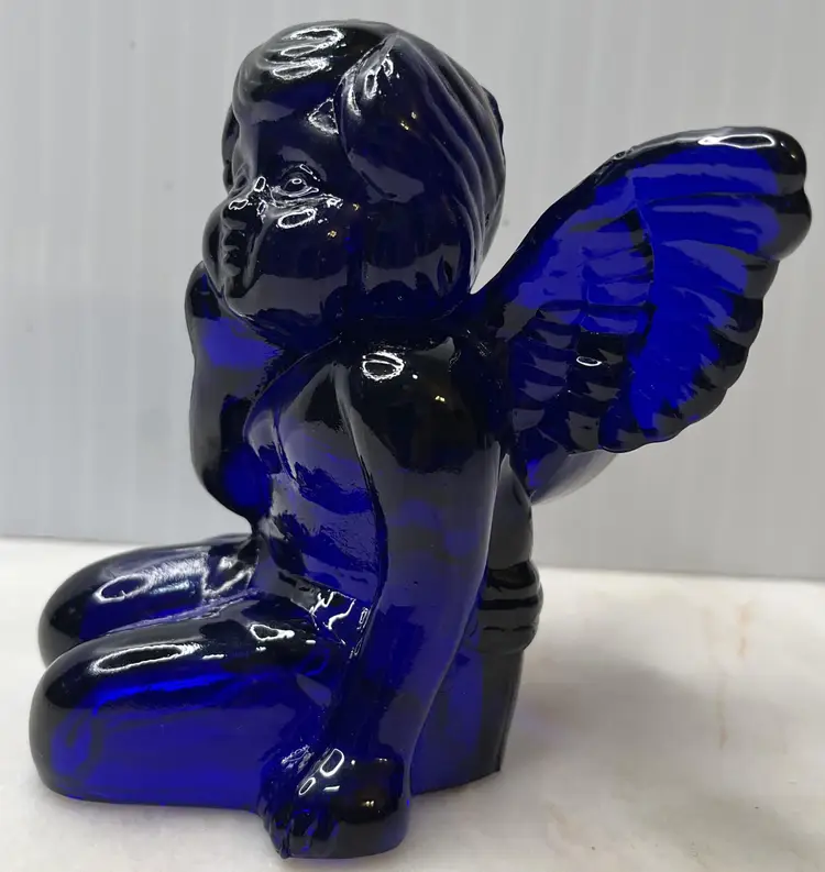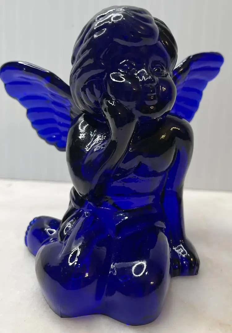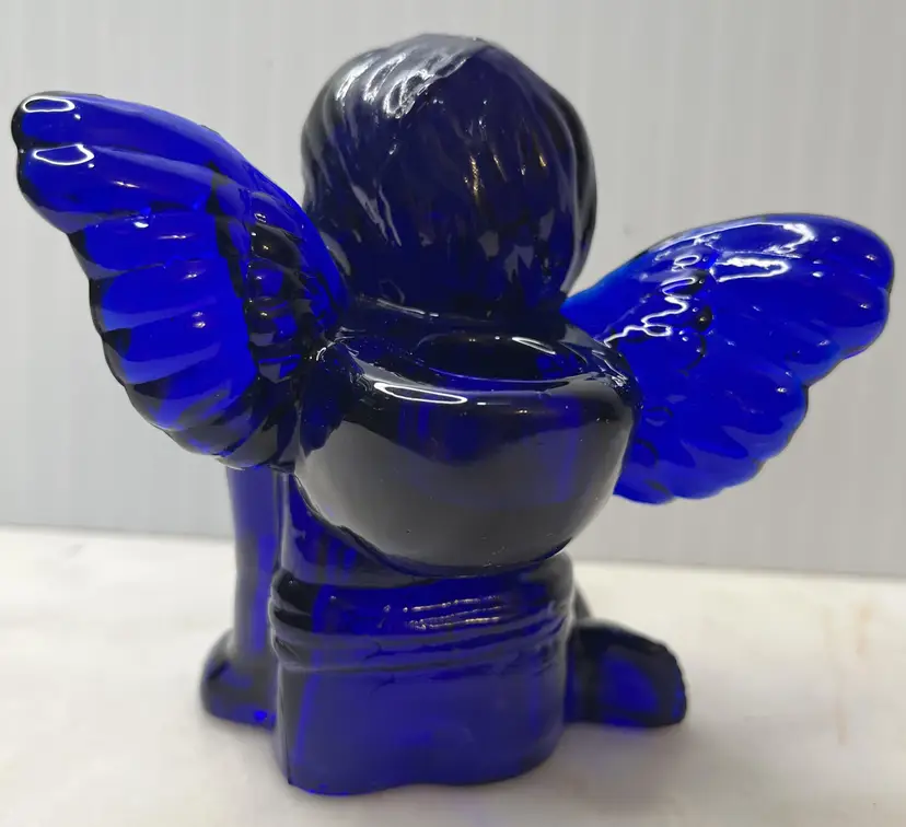Vintage Cobalt Blue Glass Sitting Angel Cherub Taper Candle Holder