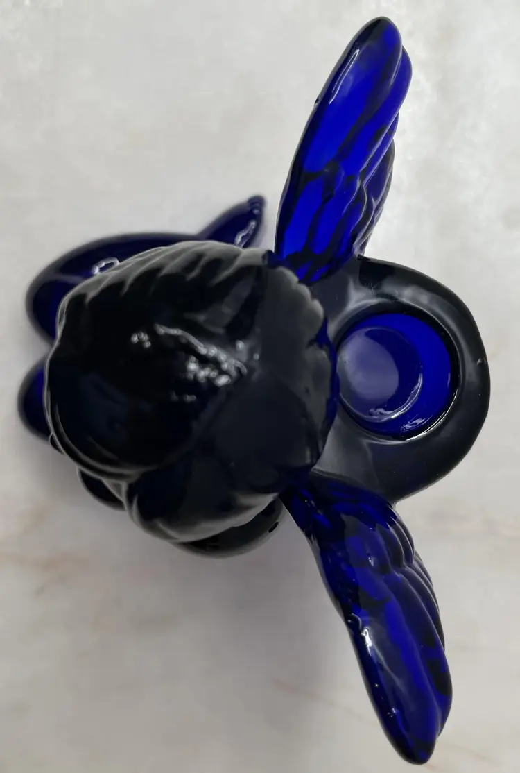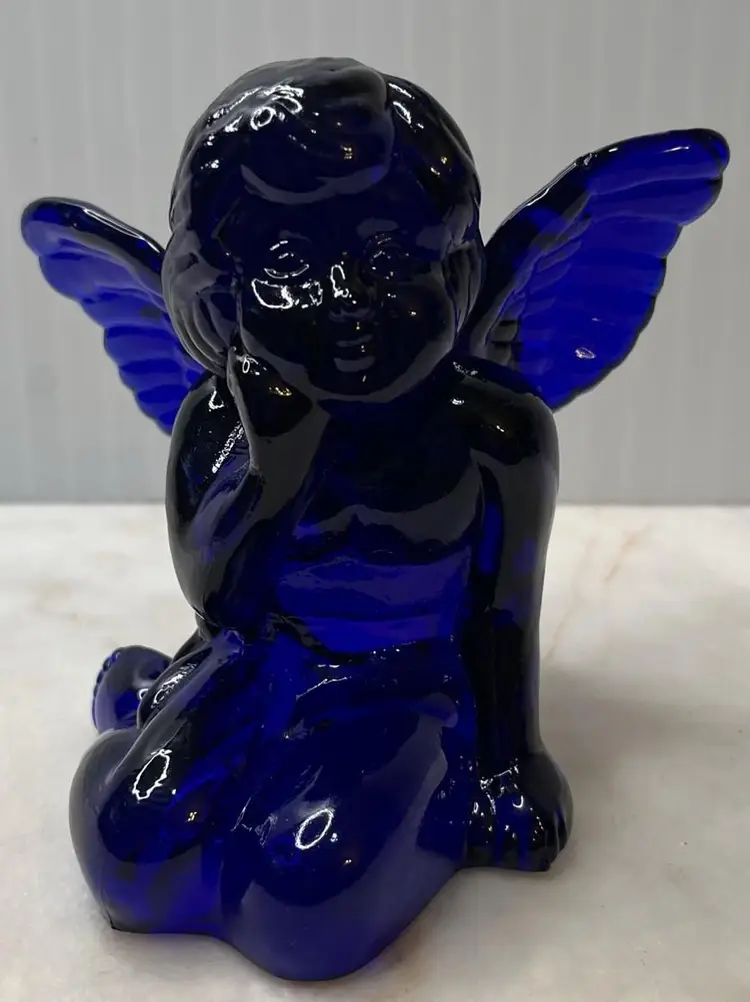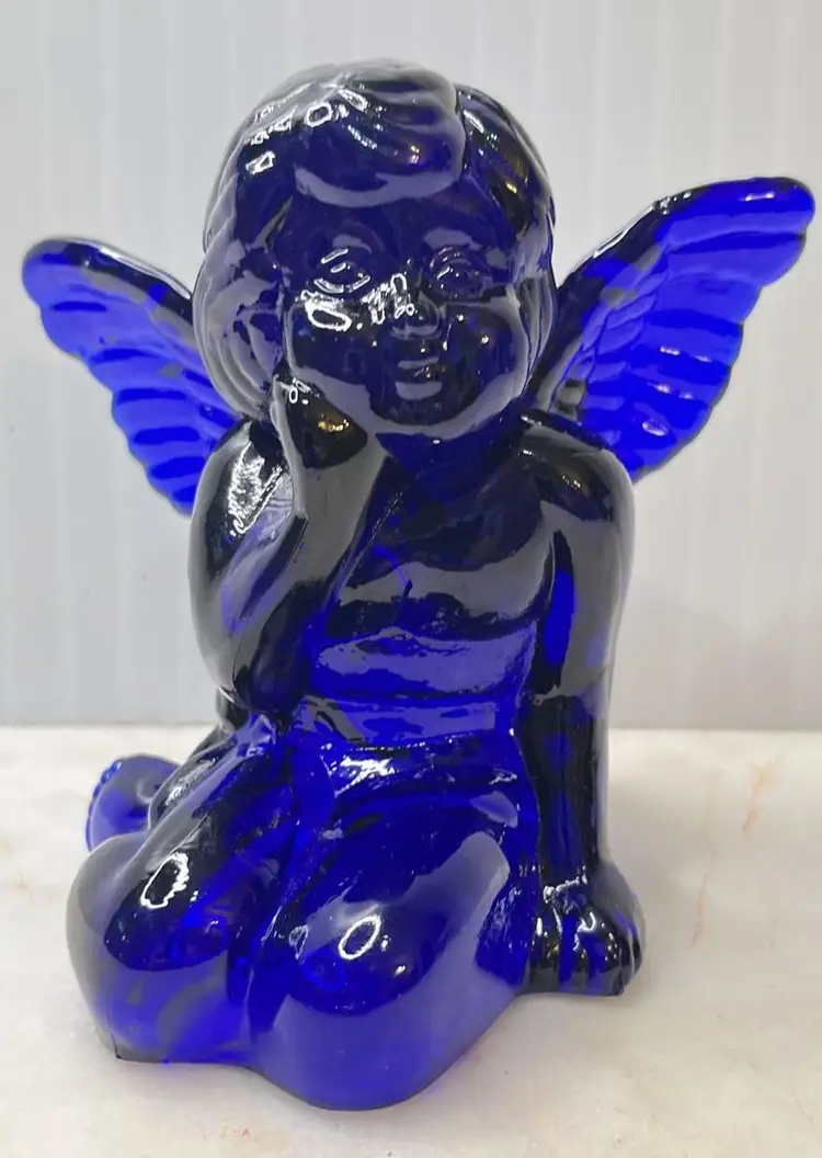 Vintage cobalt blue glass sitting angel cherub taper candle holder. Measuring 4 3/4" in height and 4 3/4" in length.