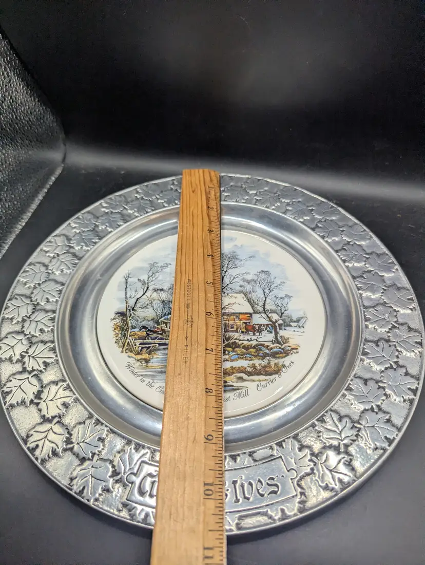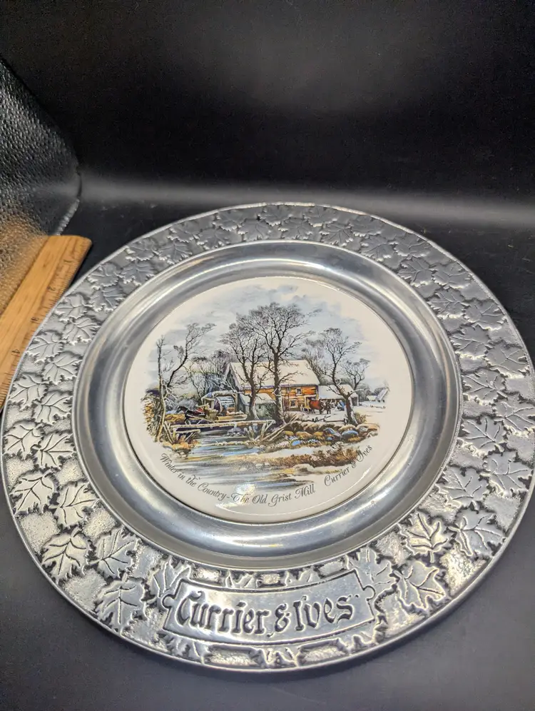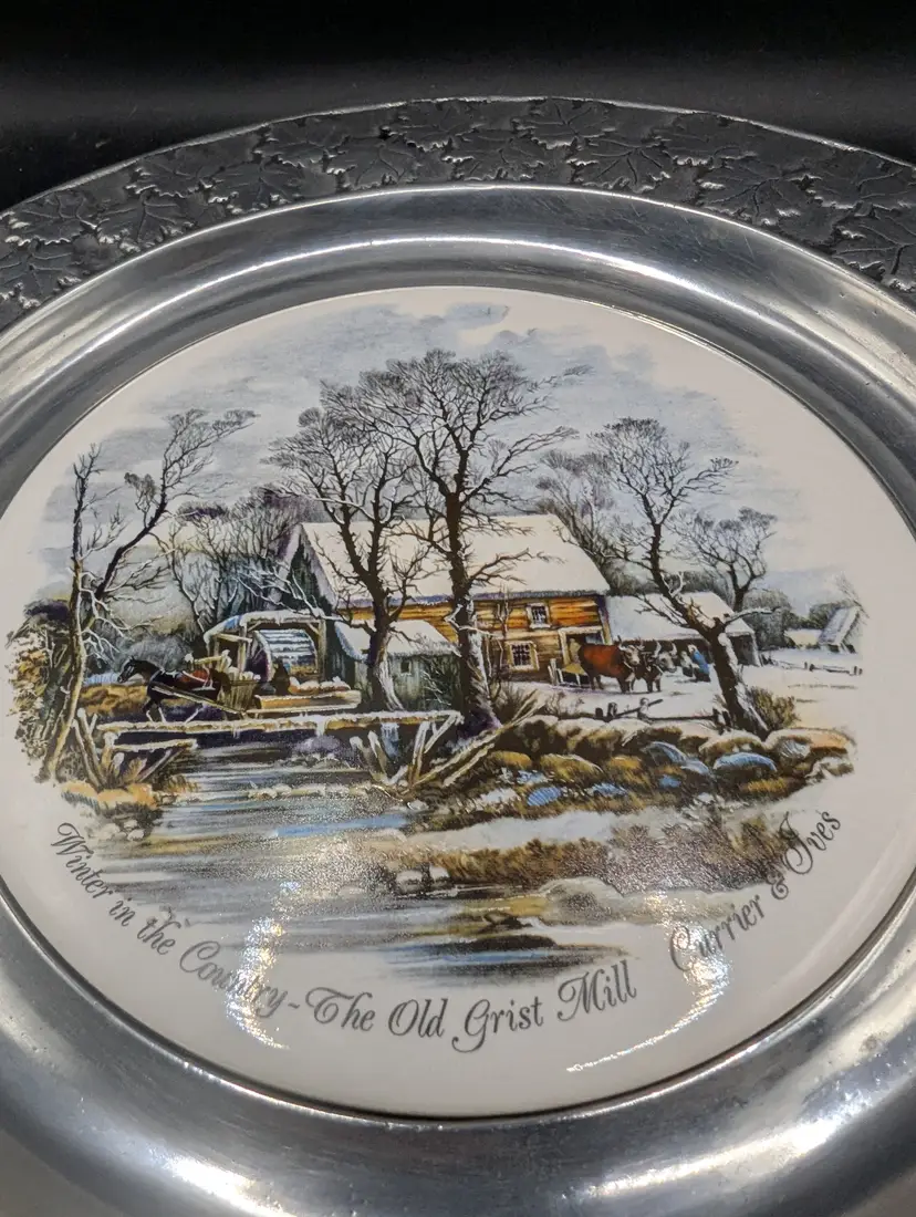 This is a lovely Vintage Currier & Ives Winter in the Country The Old Grist Mill Decorative Plate by Carson Pewter. It measures 10.75 inches in diameter. It has a center round tile plate depicting the Old Grist Mill in Winter. No chips or cracks. Please see all pictures for condition and measurements.