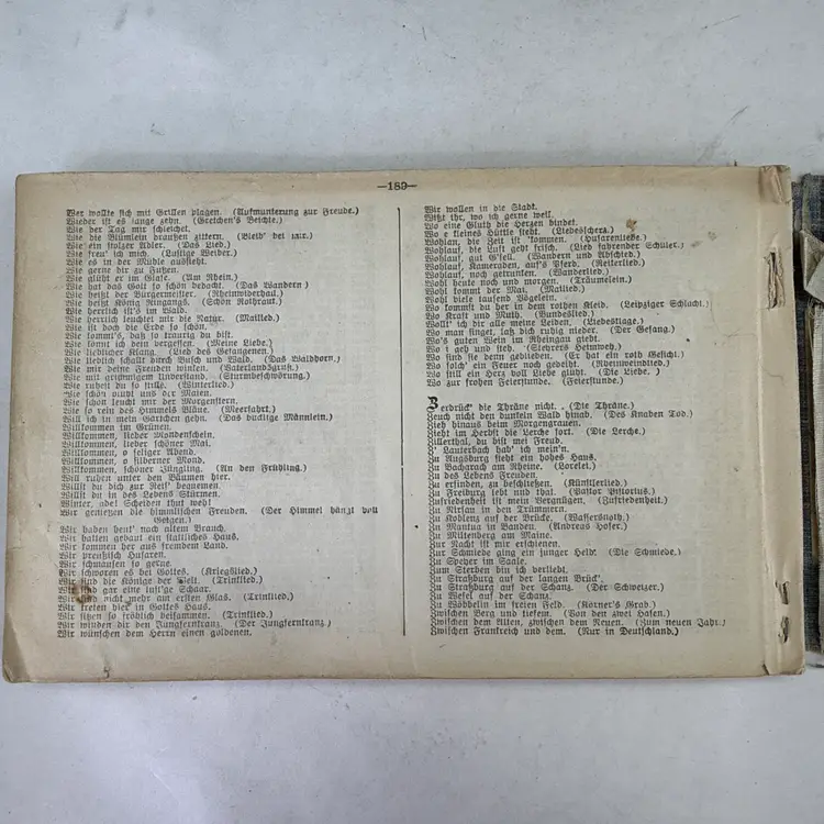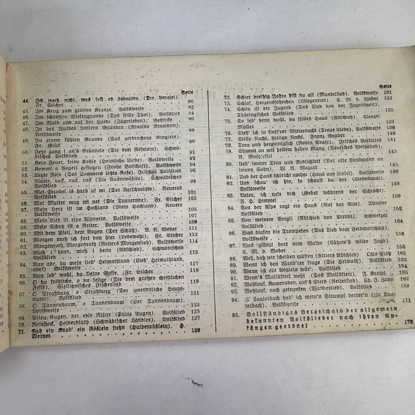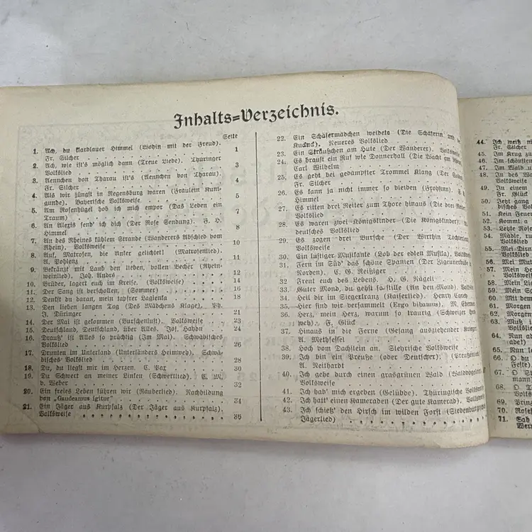 This vintage German folk song book features an extensive collection of songs with musical notations, showcasing cultural and historical significance.