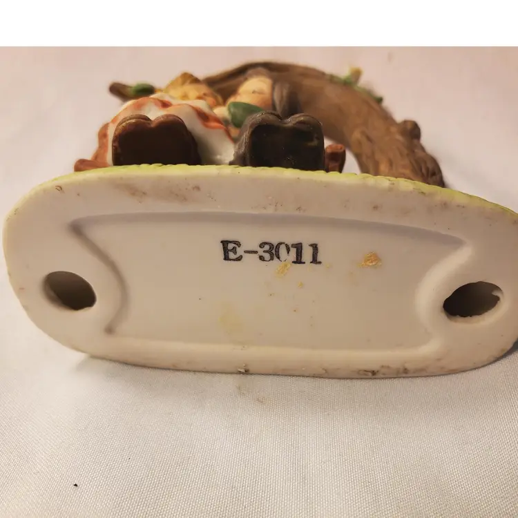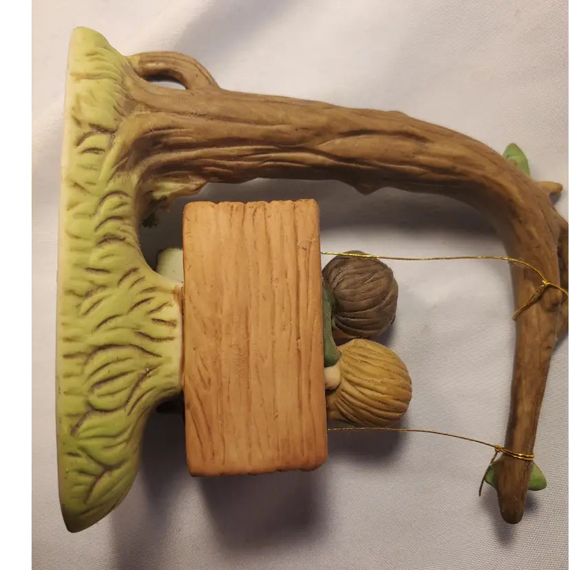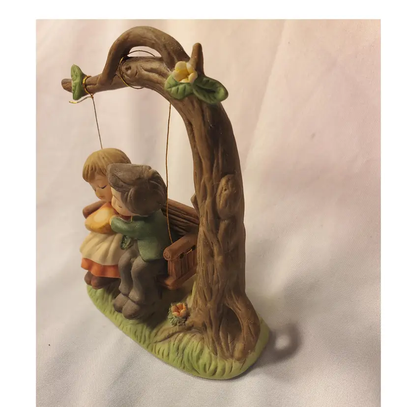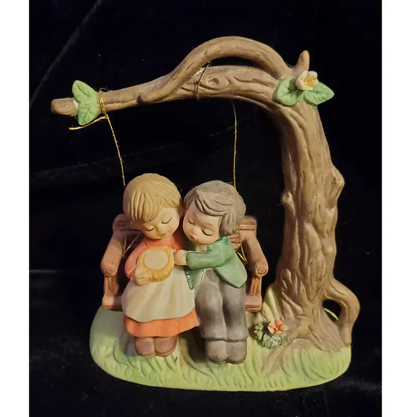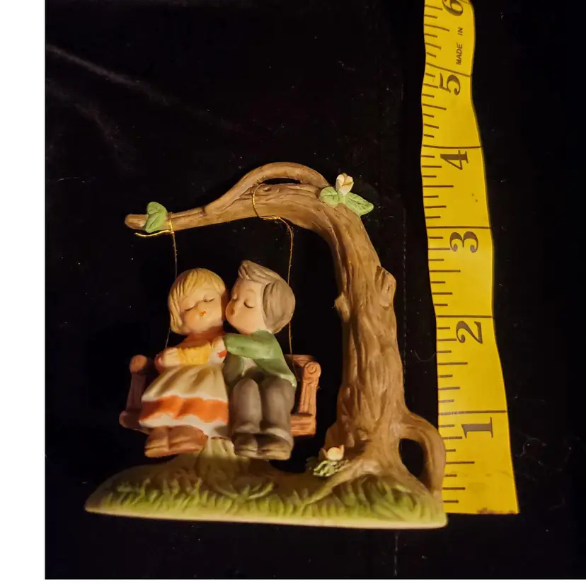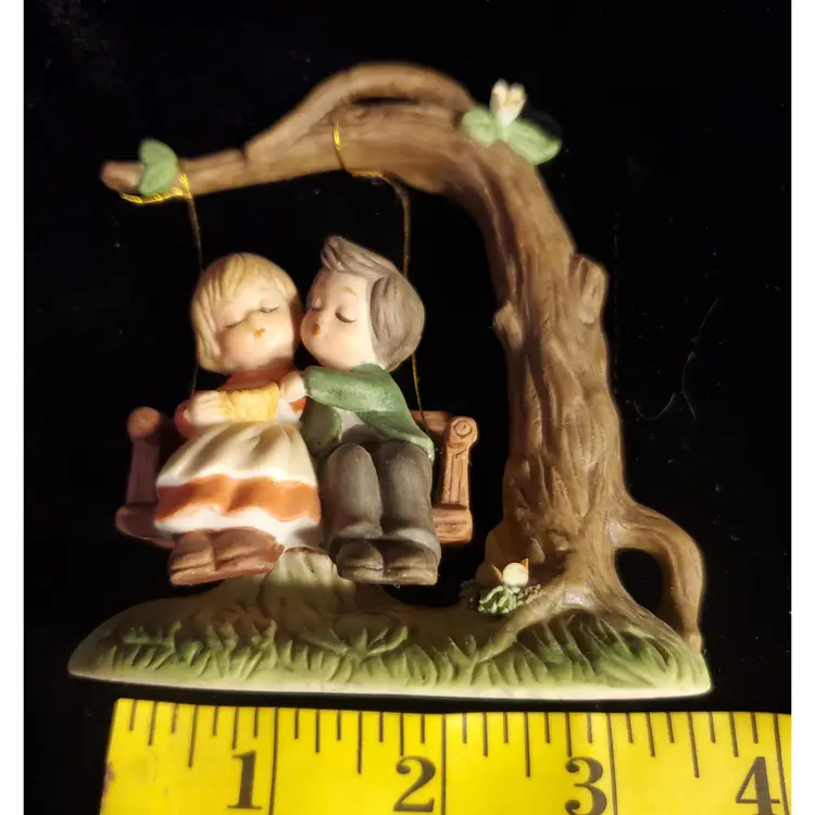 Super cute bisque cuddling couple on tree swing by Enesco. Fine detail on this including tiny flowers and great textures on tree and swing. Handpainted detail looks good and no fade , chips or cracks. Measures 4 " tall 3 .25 " wide. No original sticker. Model # stamped on bottom.