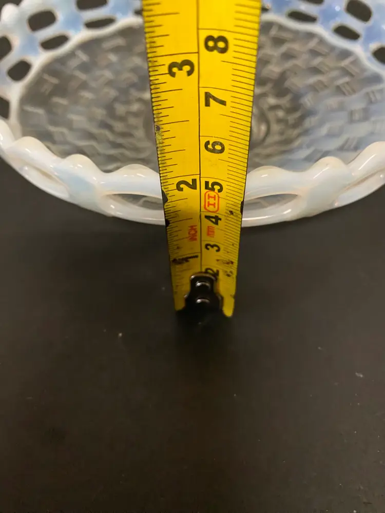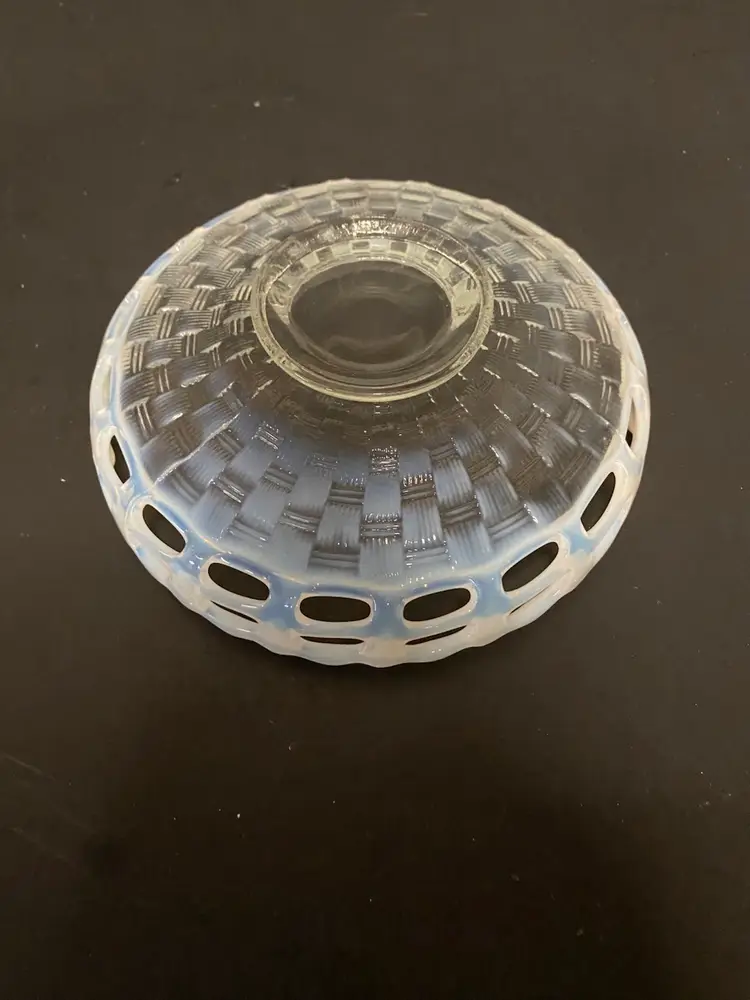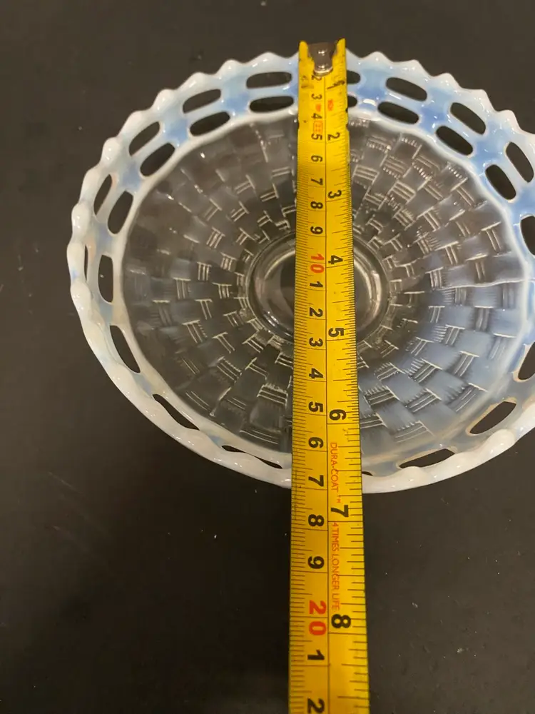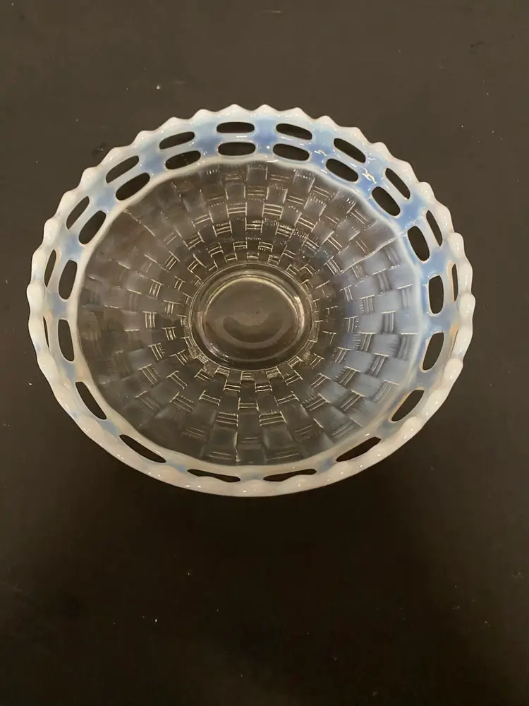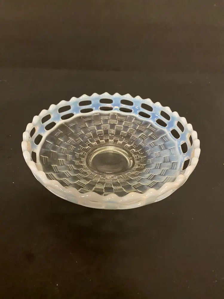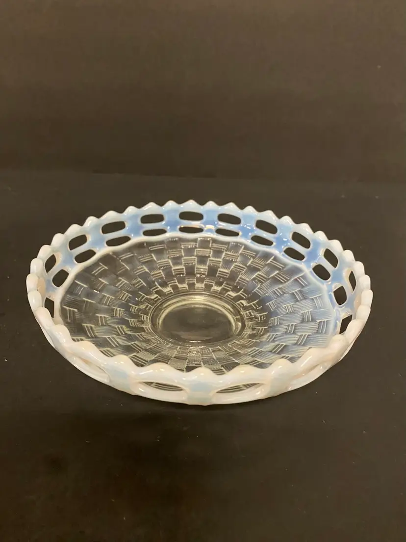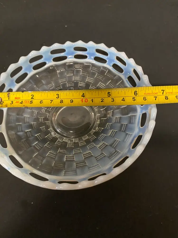 Vintage Fenton Opalescent Glass Bowl With Basket Weave Pattern, Light Blue Tint