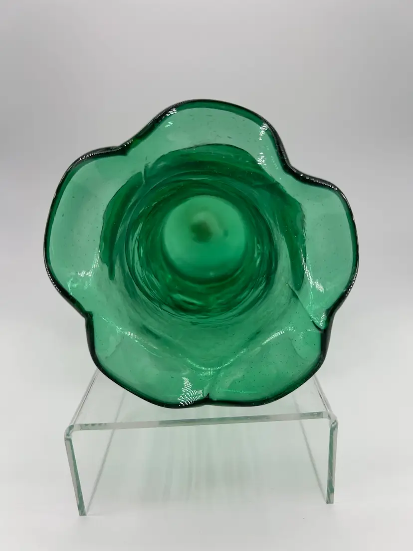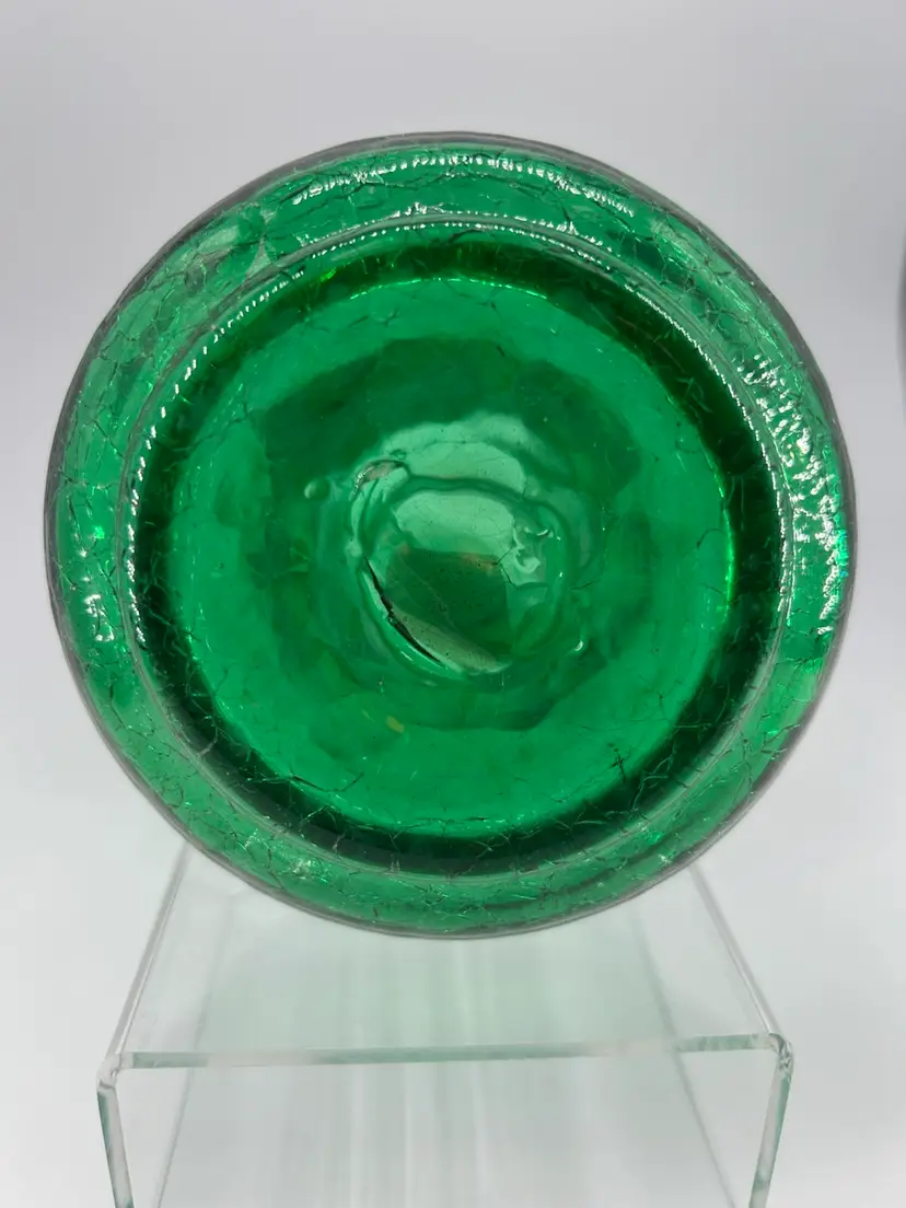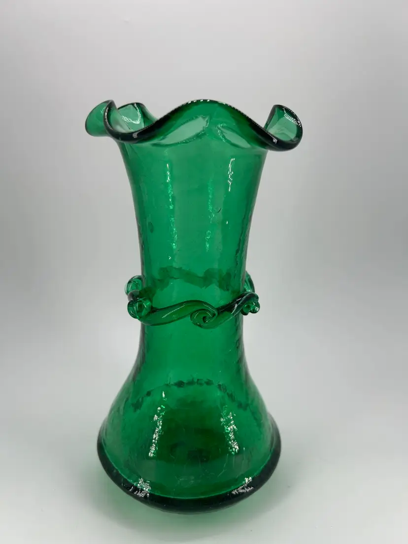 This piece is an art glass hand blown crackle glass vase with a ruffled rim and an applied band. There are no chips or cracks. It stands 8 inches tall and 3.75 across the top.
