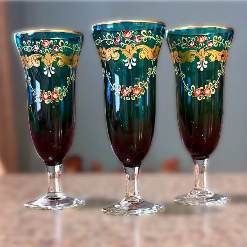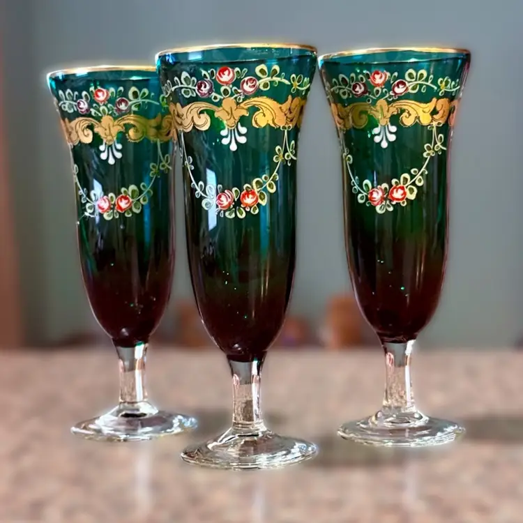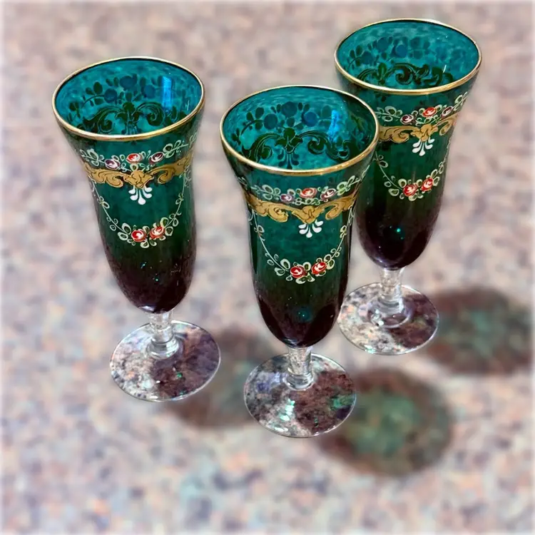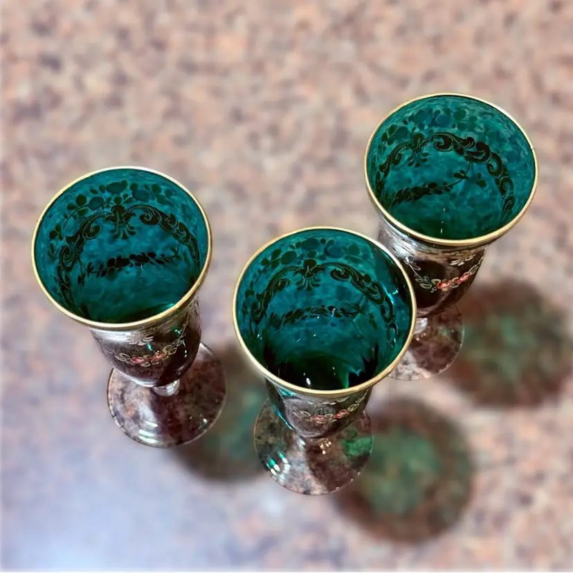 Vintage Green Glass Handpainted Floral Gilded Aperitif Glasses (3) (KK)