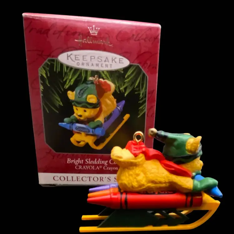 This Hallmark Keepsake ornament features a playful sledding scene. The small, lightweight ornament features sleds, figures, and scene details. It includes small crayon-shaped accents that add a sense of color and fun. The final in the 10th of a collectible set,