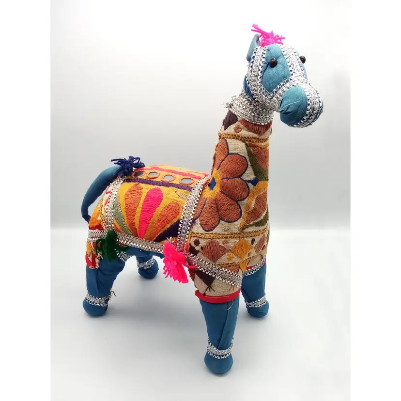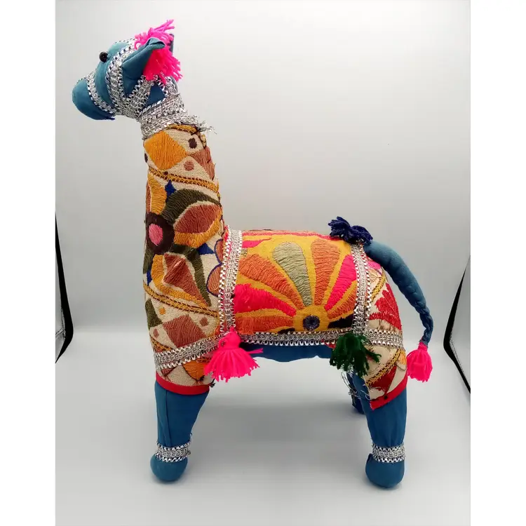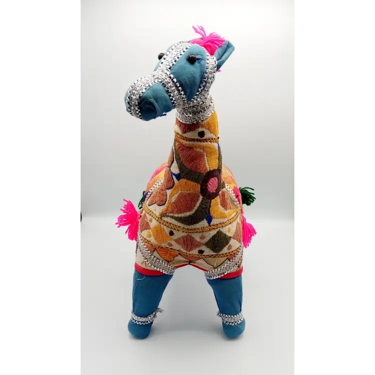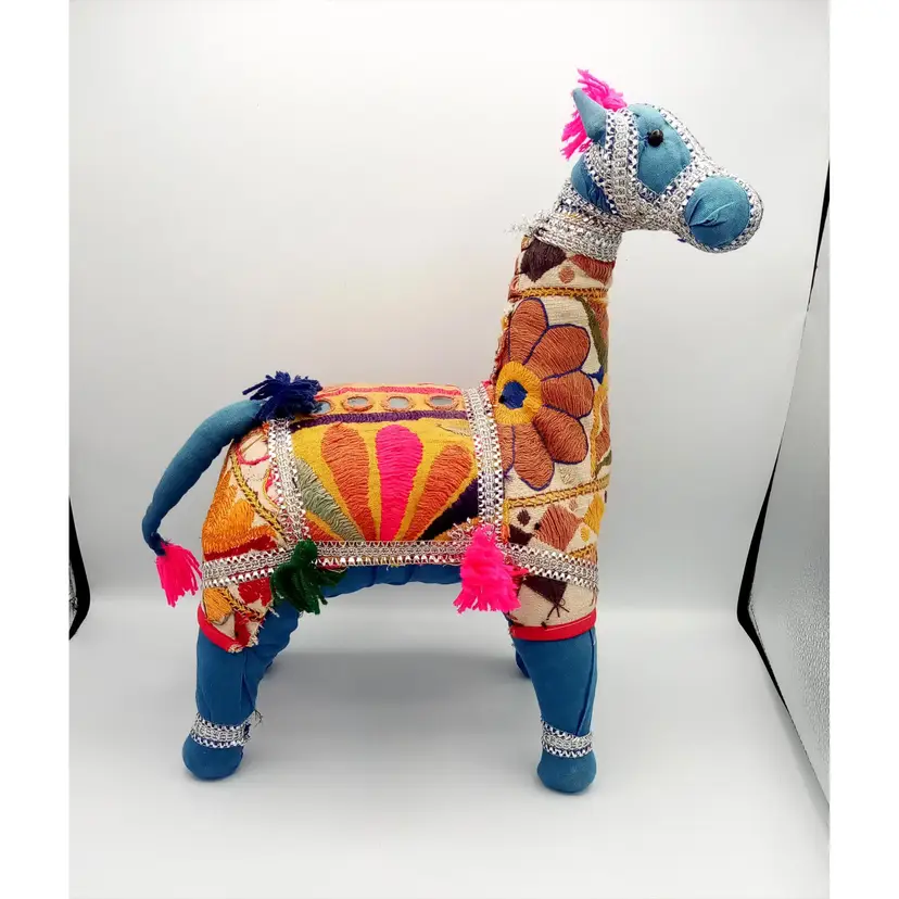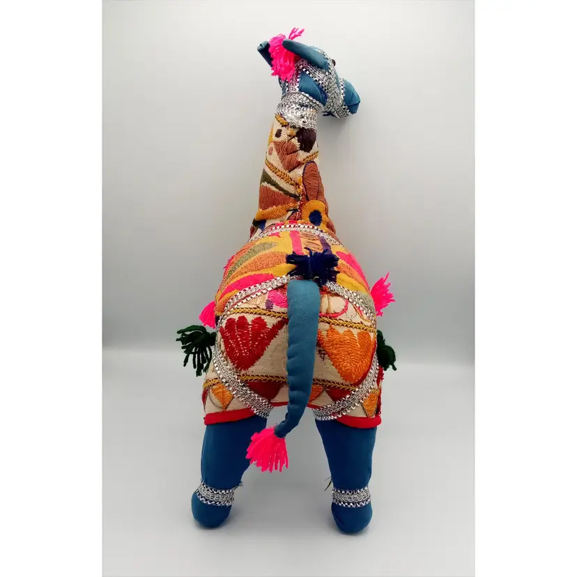 This unique vintage item is a large hand-crafted stuffed cotton figure of a giraffe, measuring 15" in height and 9" long. The intricate embroidery work on the giraffe adds to its charm and style, utilizing colorful threads, fabric patches, buttons and small mirrors. This collectible piece was handmade in India and is in excellent condition.