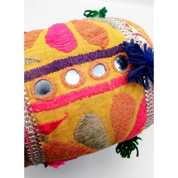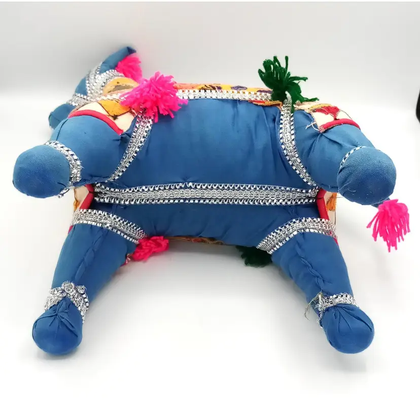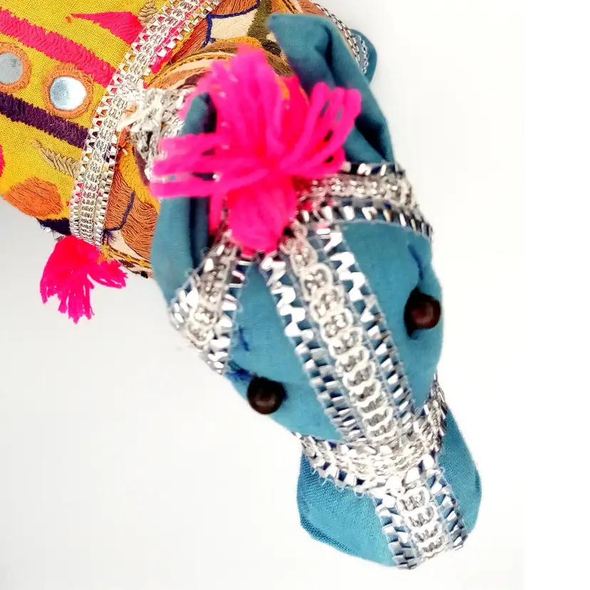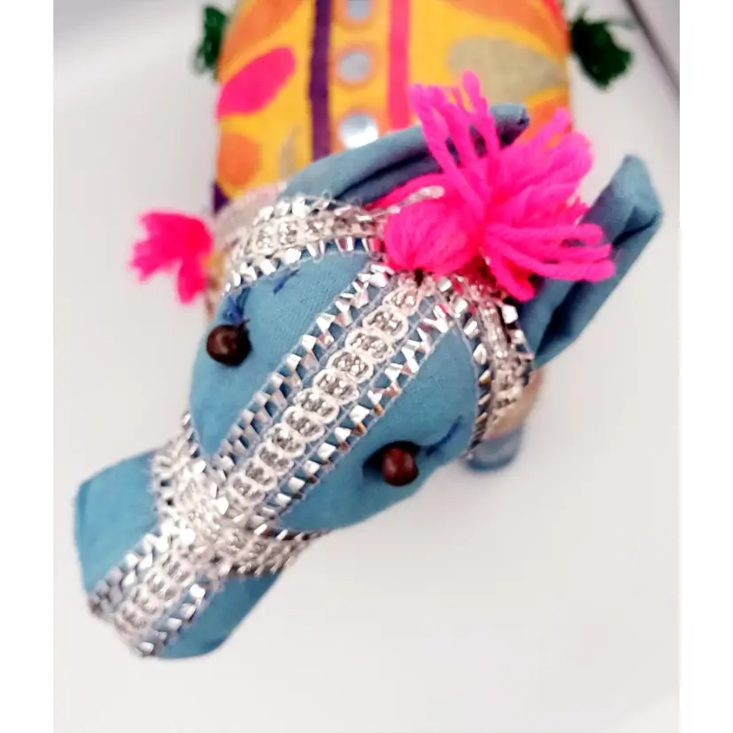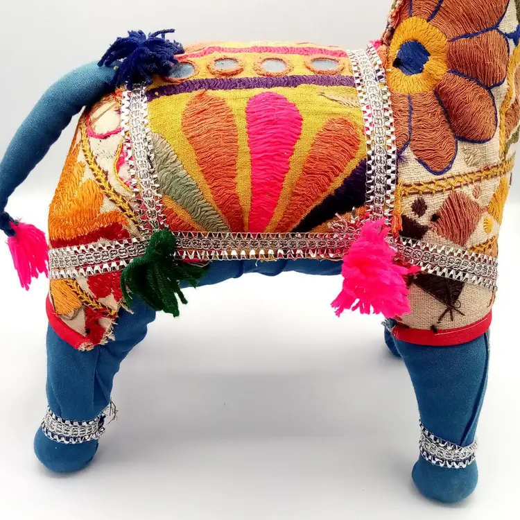 This unique vintage item is a large hand-crafted stuffed cotton figure of a giraffe, measuring 15" in height and 9" long. The intricate embroidery work on the giraffe adds to its charm and style, utilizing colorful threads, fabric patches, buttons and small mirrors. This collectible piece was handmade in India and is in excellent condition.