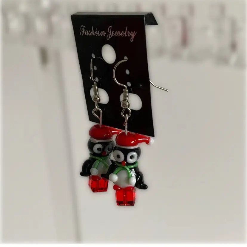 Vintage handmade lampwork glass penguins on silver tone hooks. Tgese cuties measure 3/4” across and dangle 2”.