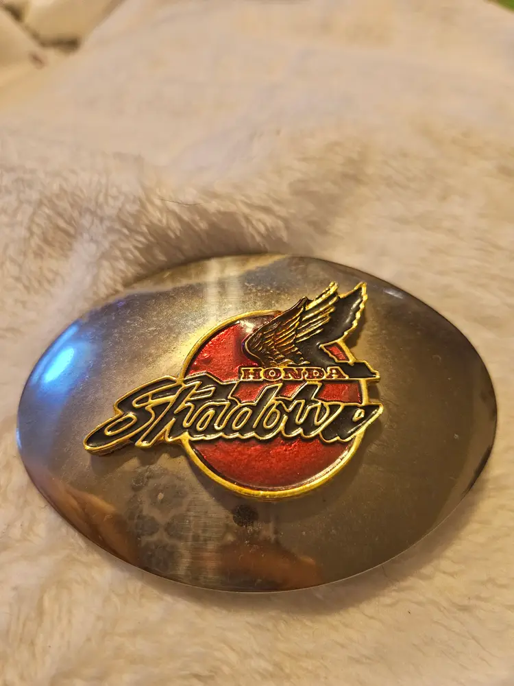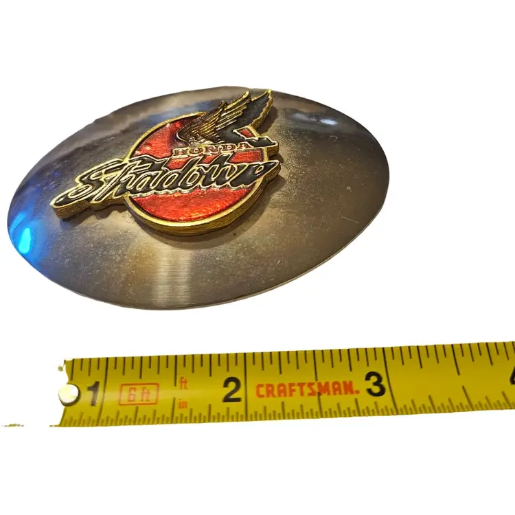 Features the Honda logo with wings and "Shadow" script in black and gold enamel on a red background.