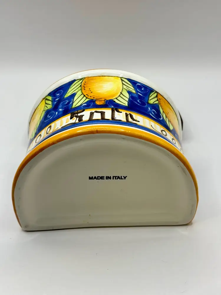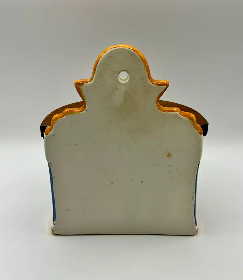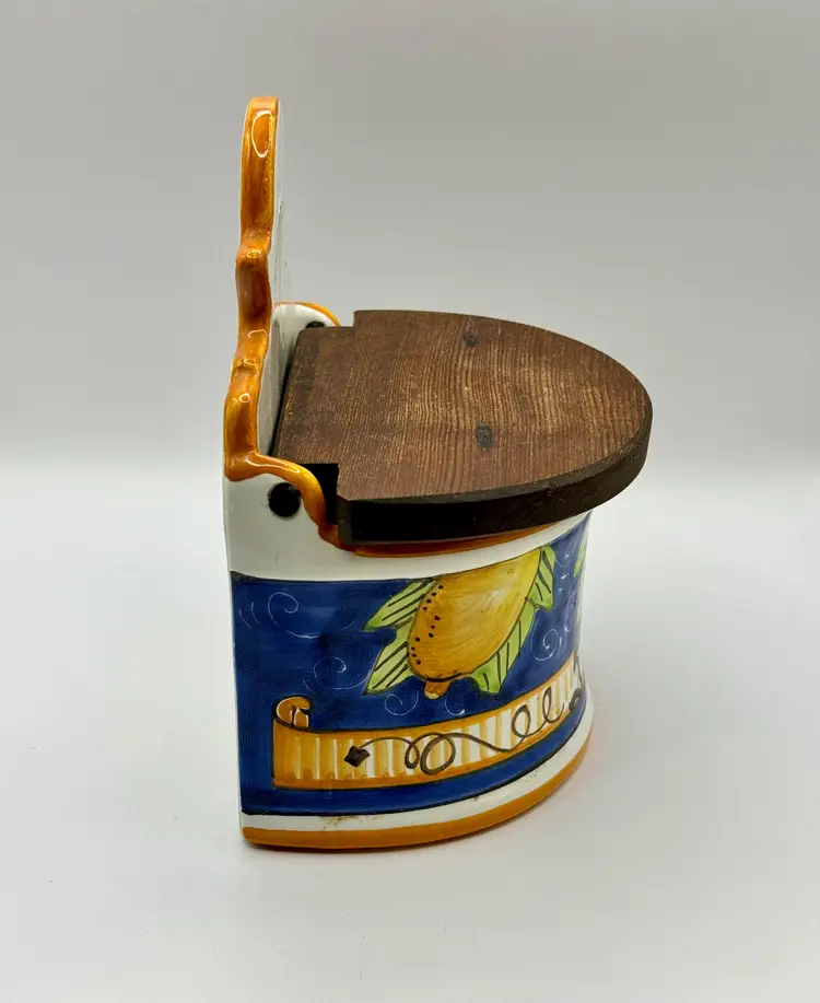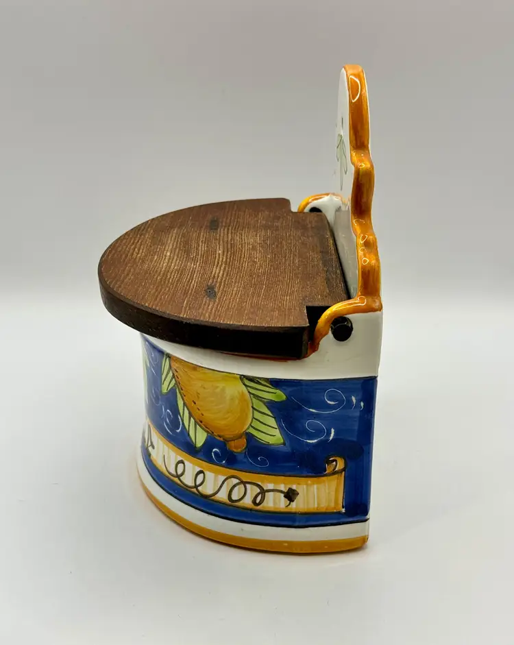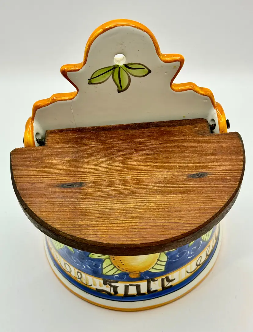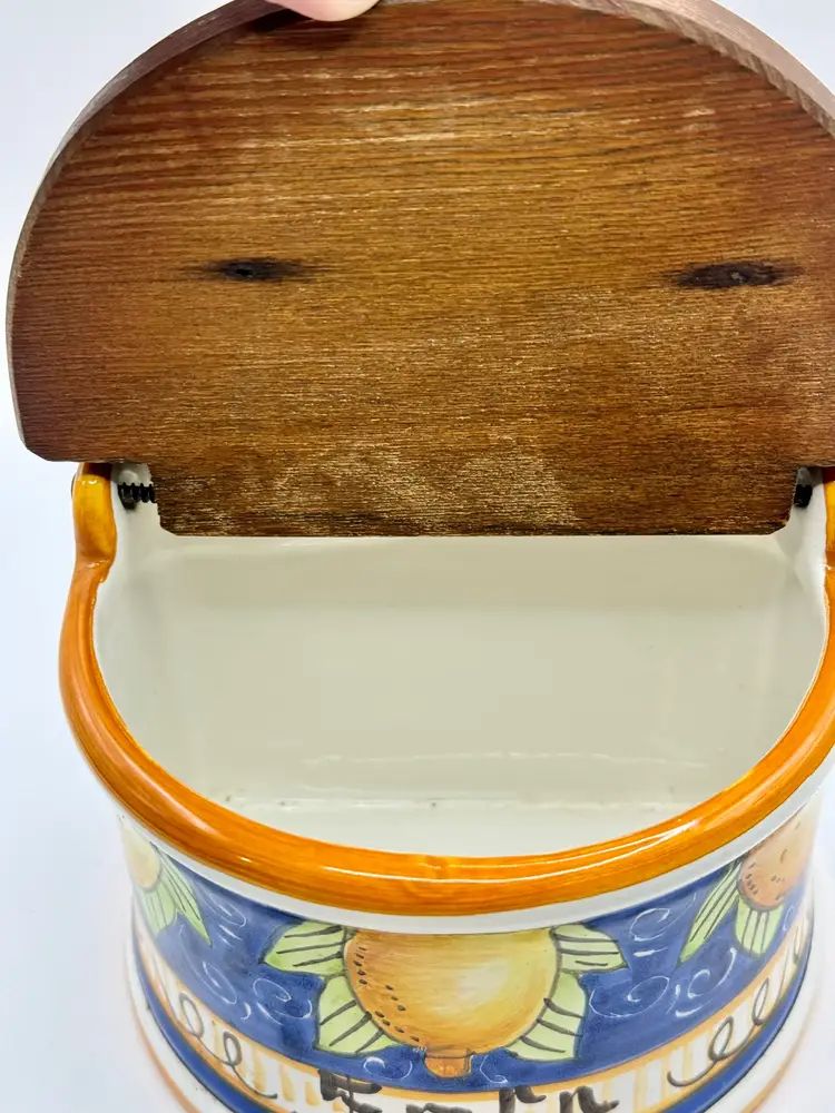 Add a zest of vintage charm to your kitchen with this hand painted ceramic salt cellar featuring a vibrant lemon pattern. Complete with a wooden hinged lid, it's perfect for entertaining or as a cheerful display piece. No chips or cracks. Measures 6x7x6. Weighs 2lb.