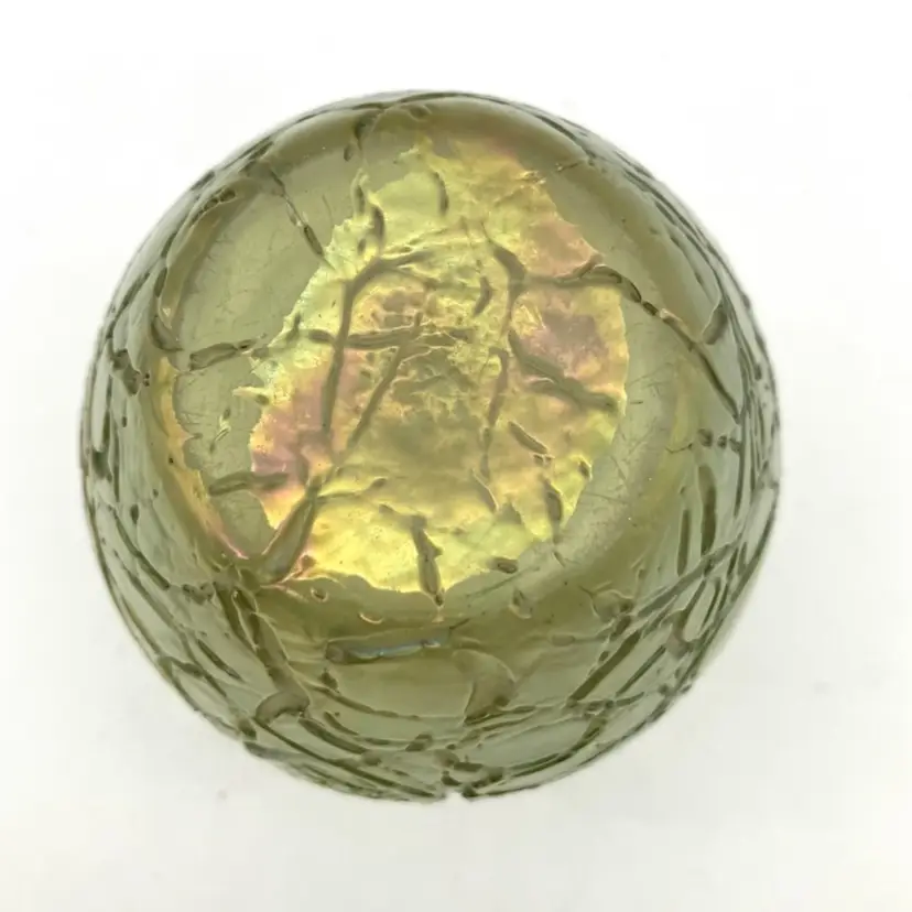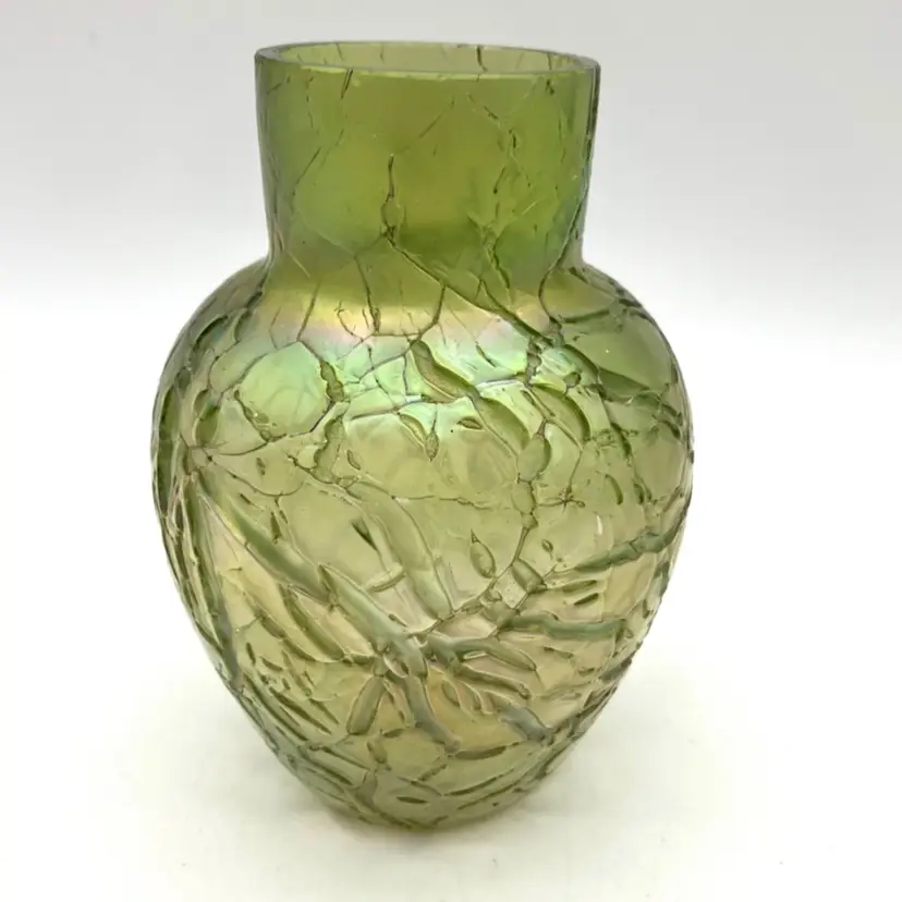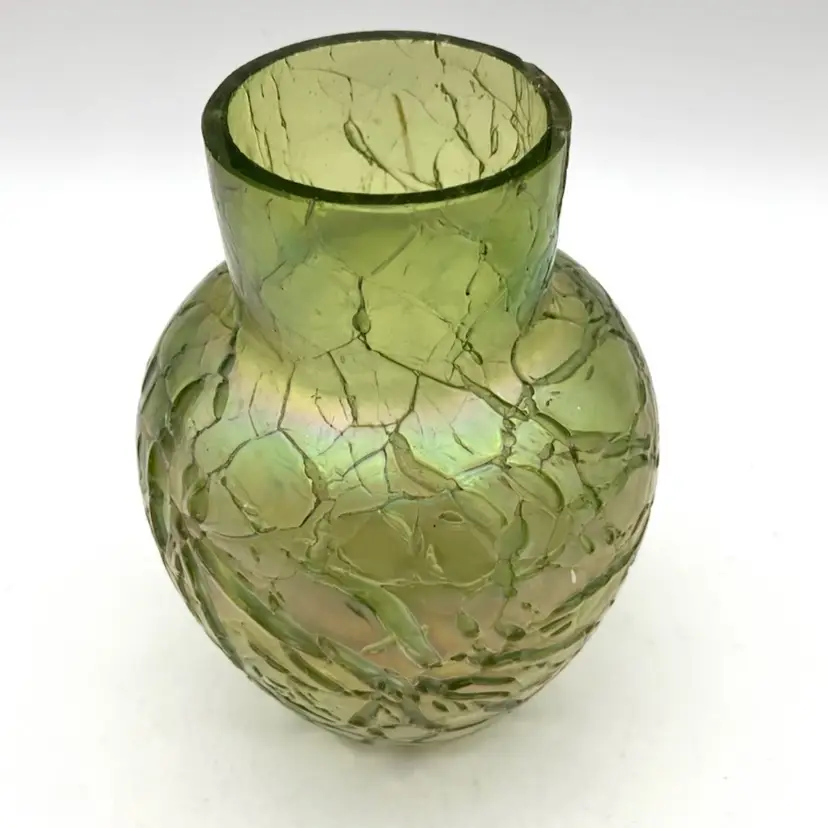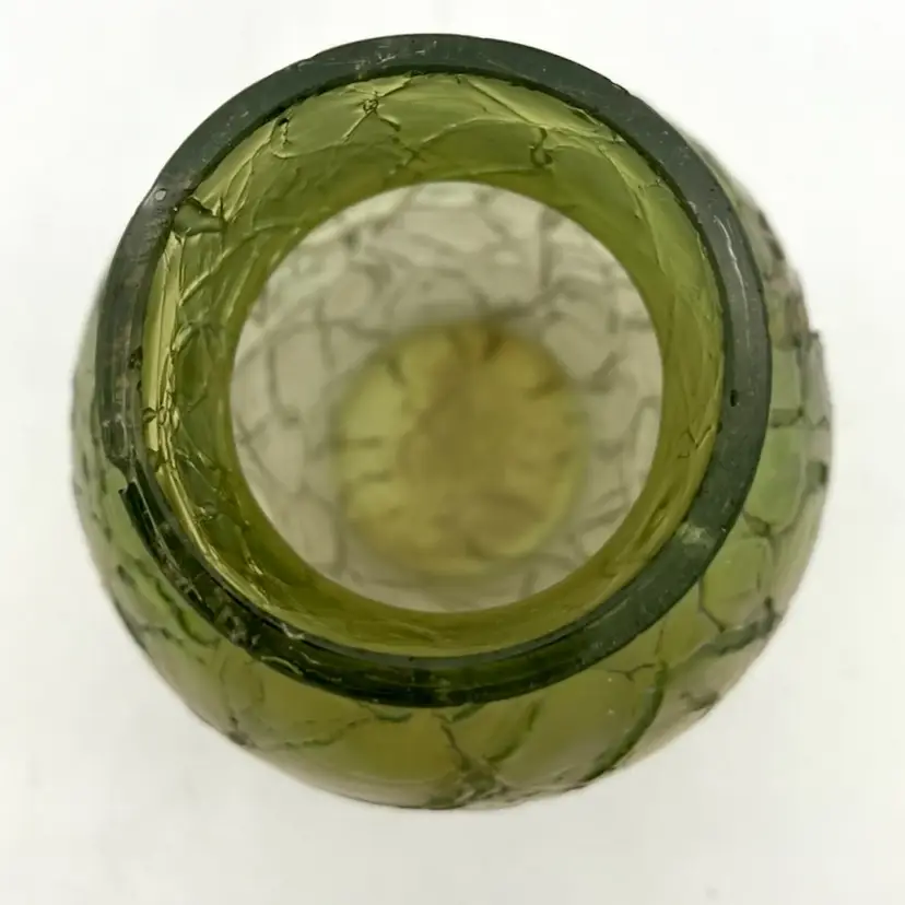 BIN - Vintage Kralik Iridescent Green Crackle Glass Vase 4.75”