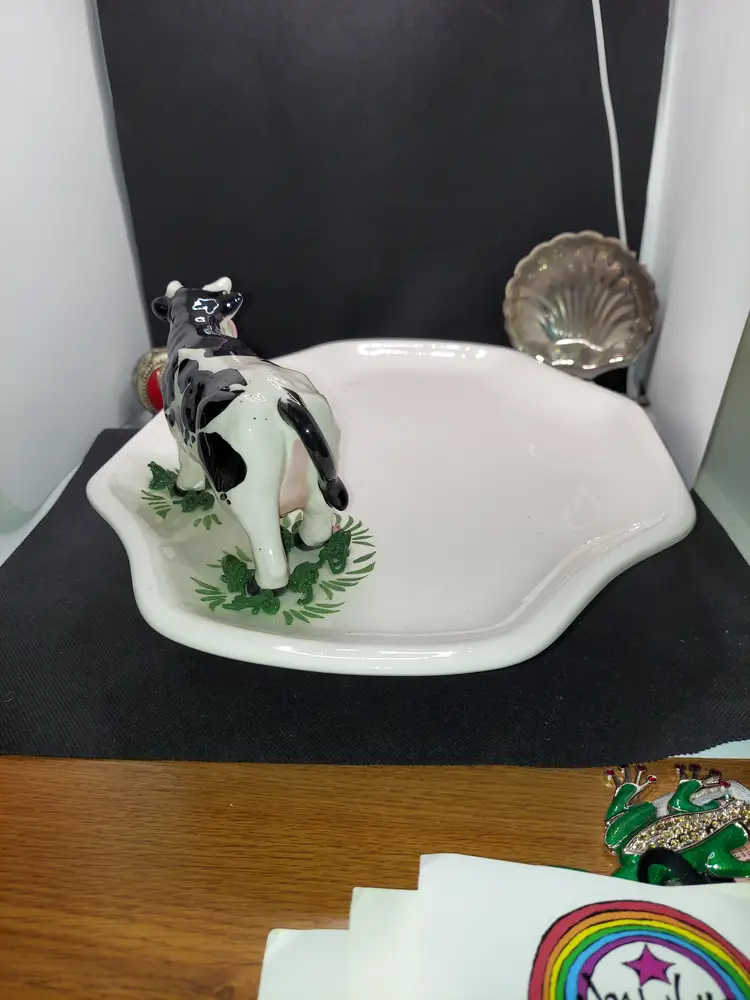 This Vintage L. A. Ceramics Cow Appetizer Plate Platter from the 1960s is a unique find for anyone looking to add a touch of farmhouse charm to their kitchen. The 3D cow is on a white base and makes it a stand-out piece for serving appetizers at any occasion OR for a Charcuterie Board! The large size and easy-to-fill compartment make it both practical and eye-catching for your dining table. Made in the United States by L.A. Ceramics, this glossy finish tray is a one-of-a-kind addition to your dinnerware collection. Seriously, trying and find another 1 like this! And the condition is Great!! It measures 15 inches long and 11 inches wide. In a super unique shape and VERY heavy and solid. This item will be the talk of your dinner party! This item is cross-posted on other apps so if you love it grab it now! Also please see our other items for sale as we love to bundle to save on shipping! All of our packages are packed with love and care so rest assured it will arrive safely.