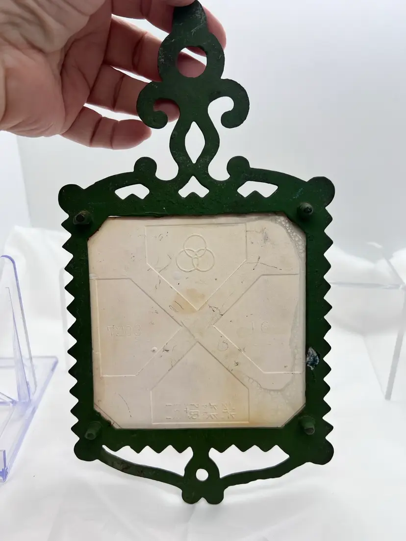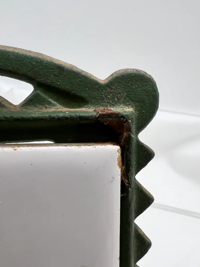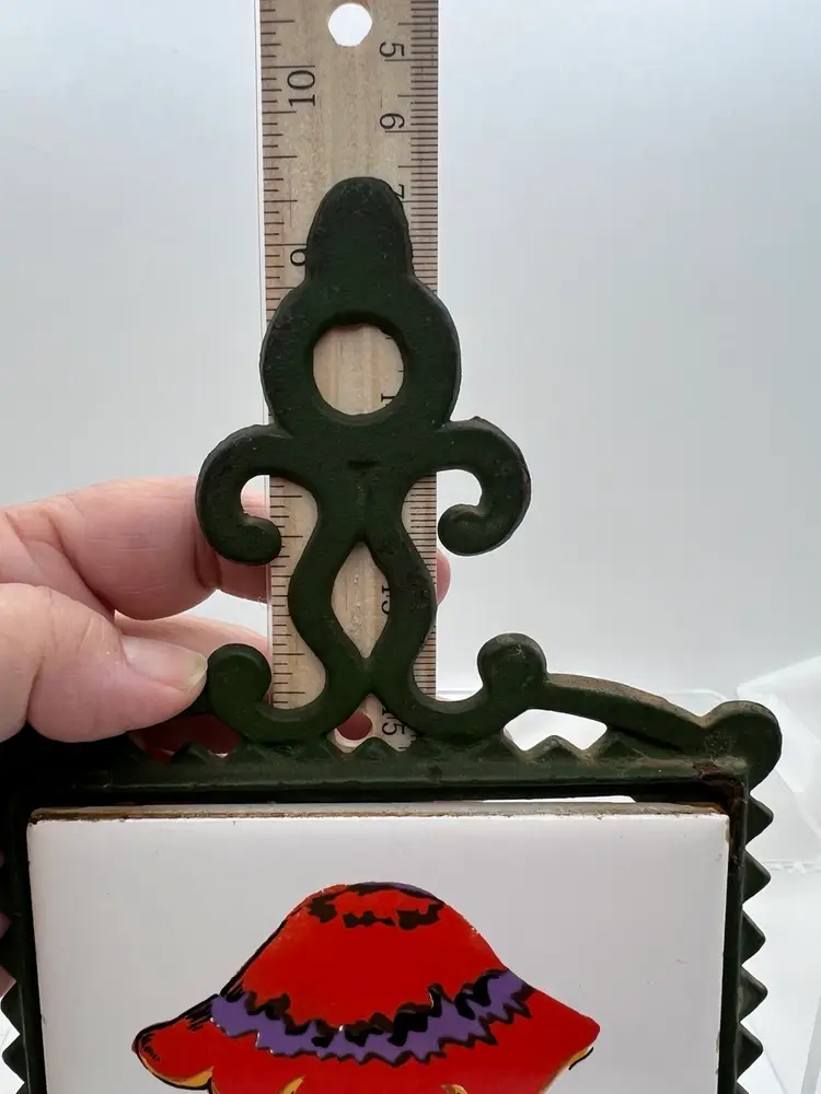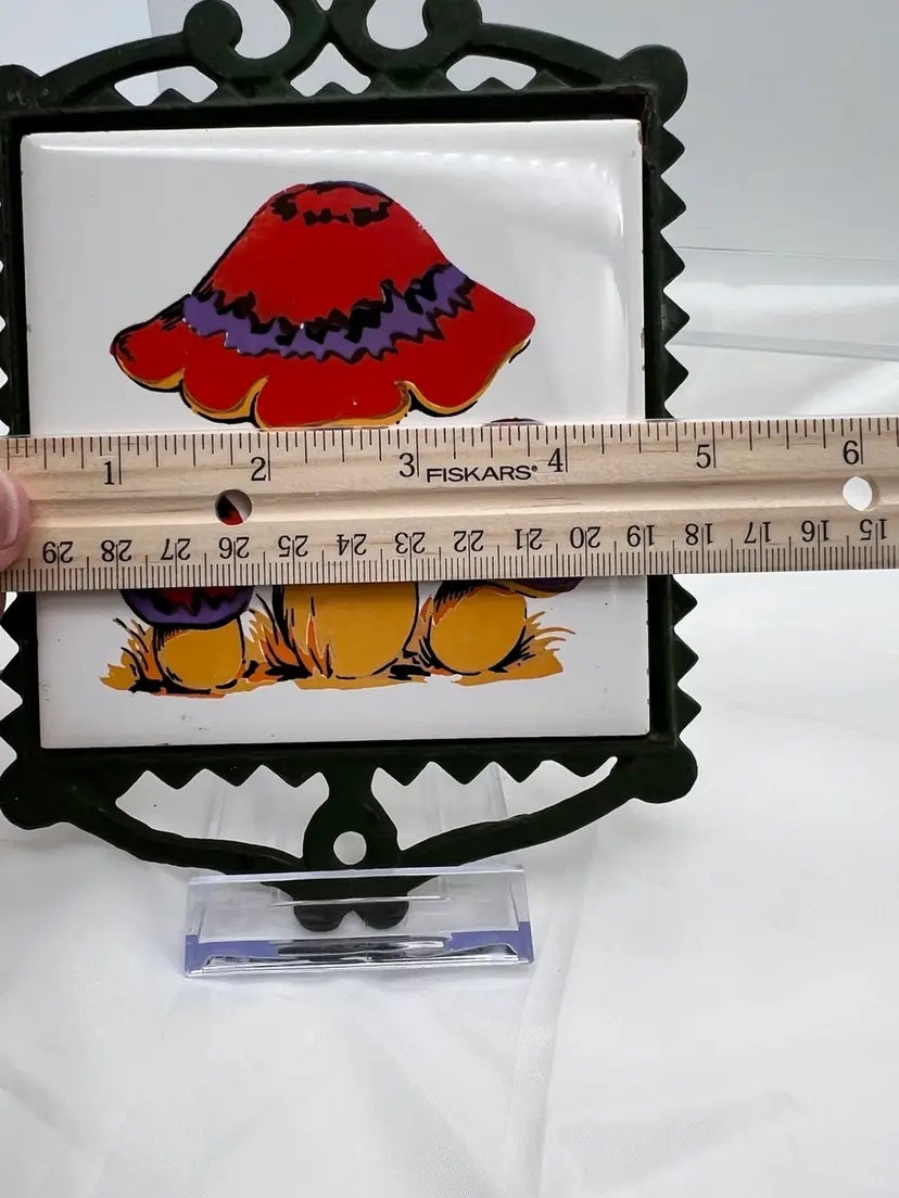 1970's ceramic tile trivet with mushroom motif mounted in a cast iron base. Marked Tiawan. 5 x 9 1/2 inches. Very retro and perfect for the vintage mushroom lover One corner of the trivet has a little schmutz of excess glue that has discolored it, see pictures for detail