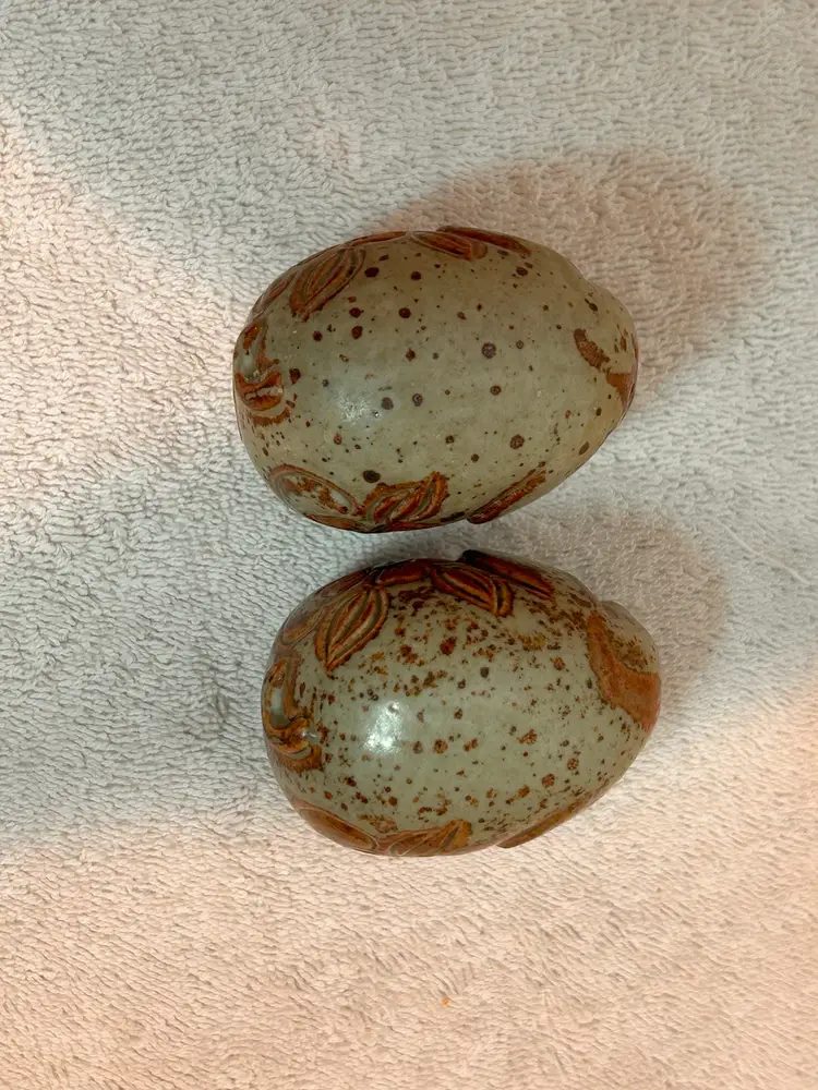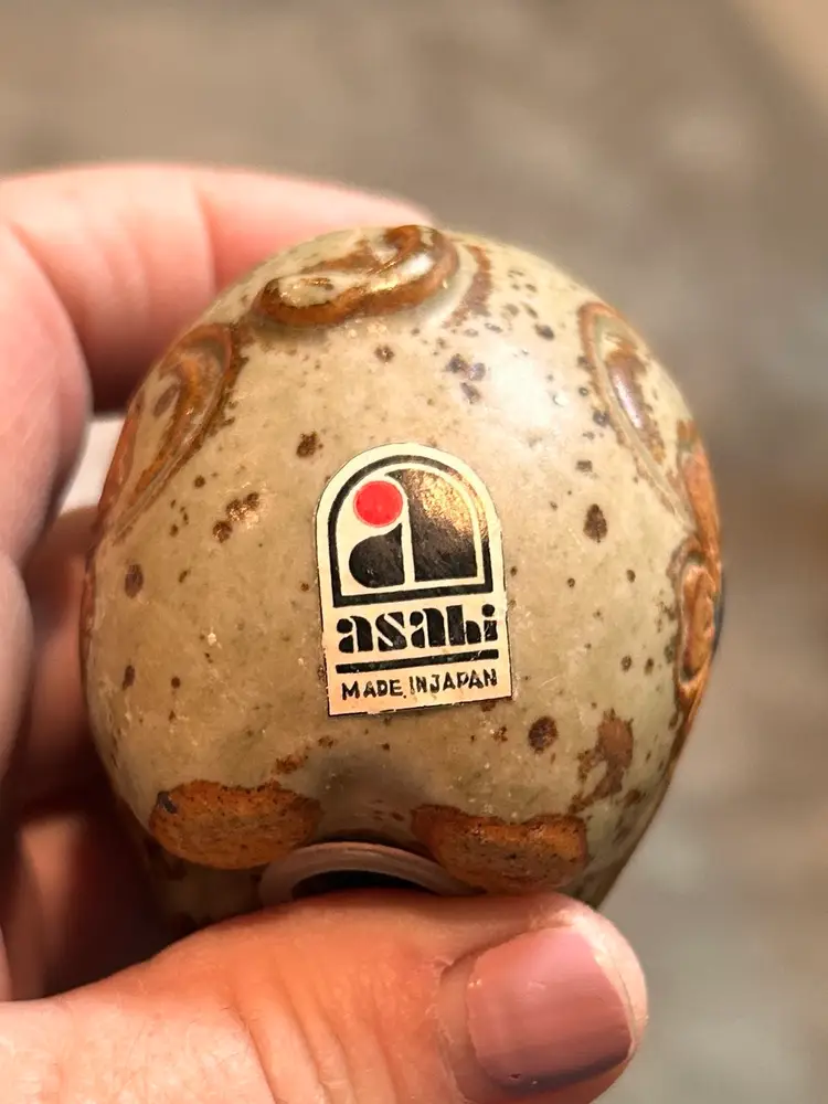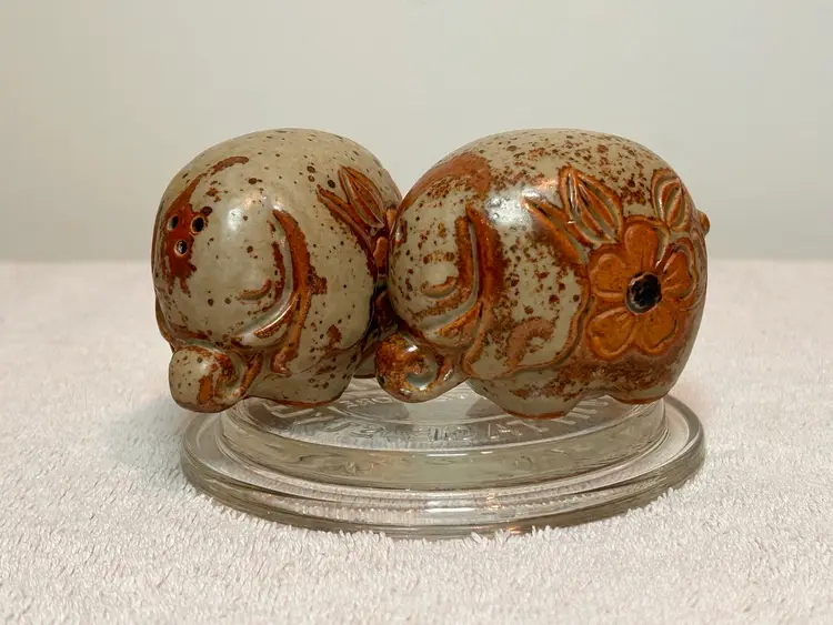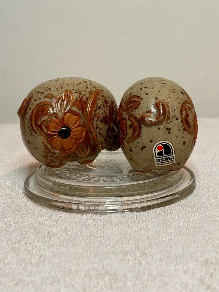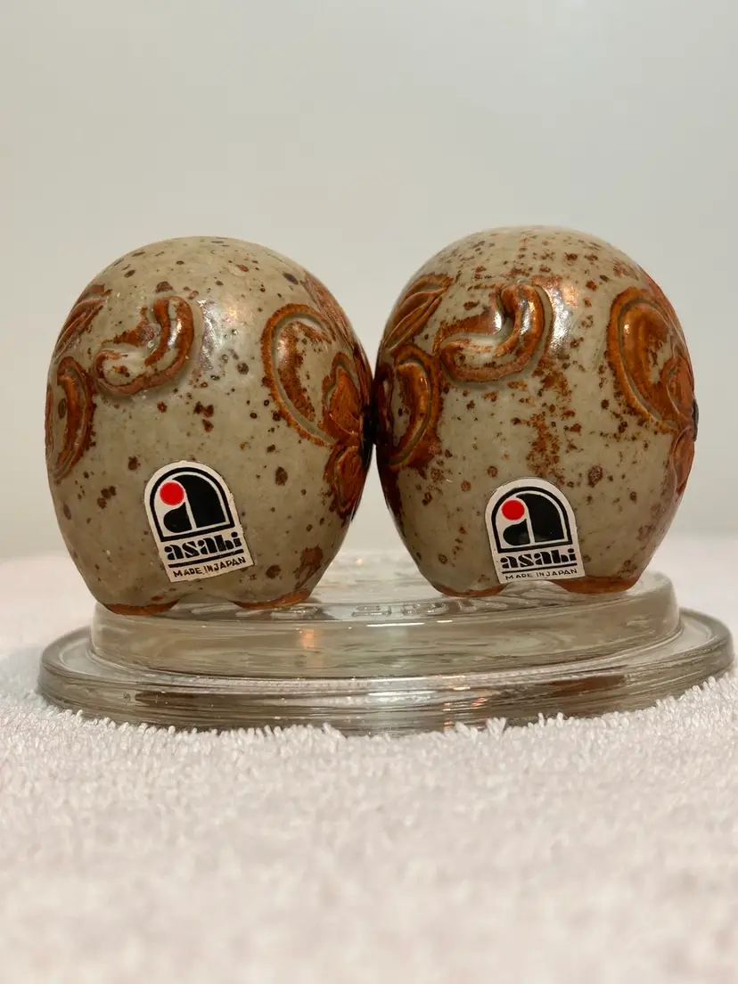 Charming kitschy, farmhouse vibe pair of salt n pepper shakers. Earth tone color collectible pair of salt n pepper shakers. This vintage set features a brown speckled glaze and a carved floral motif. Plastic stoppers intact. No chips or cracks. Excellent vintage condition. Made in Japan. Asahi sticker attached to both pieces. Approx 2.25”x1.5” ** if you’re loving kitschy please check out my other vintage listings.