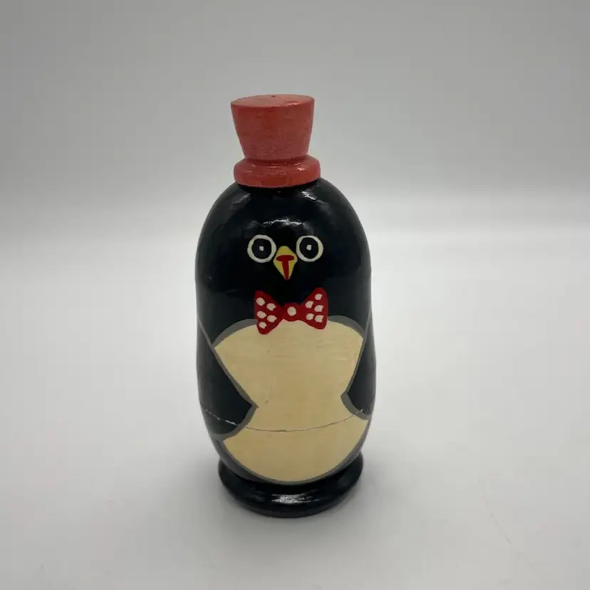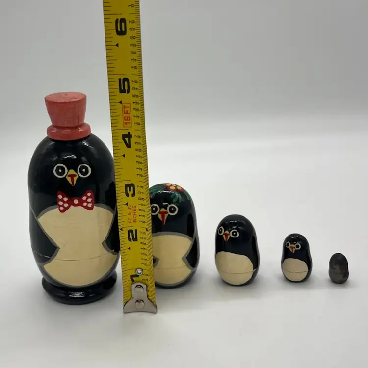 This vintage penguin Russian nesting dolls Matryoshka set of 5 is a handmade collectible that showcases traditional Russian culture. The intricately hand-painted wooden dolls feature intricate designs and detailing, making them a unique and charming addition to any collection. These nesting dolls offer a glimpse into the artistry and craftsmanship of the Russian people.