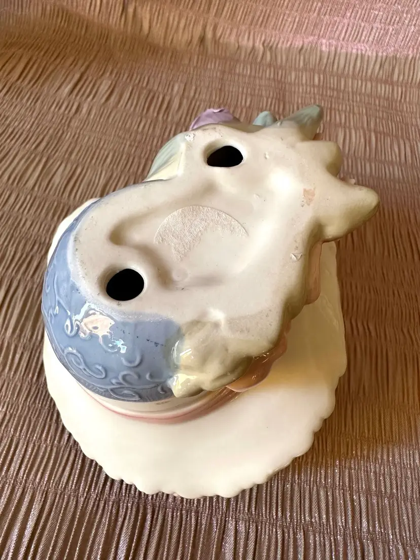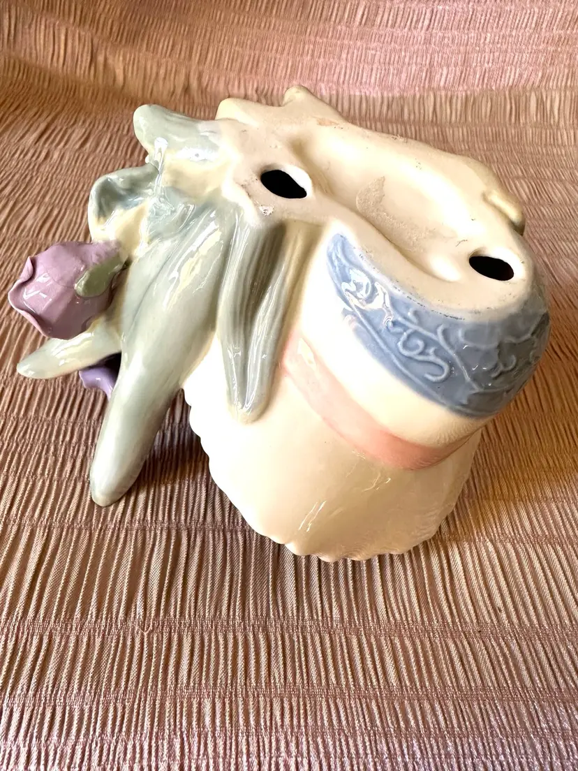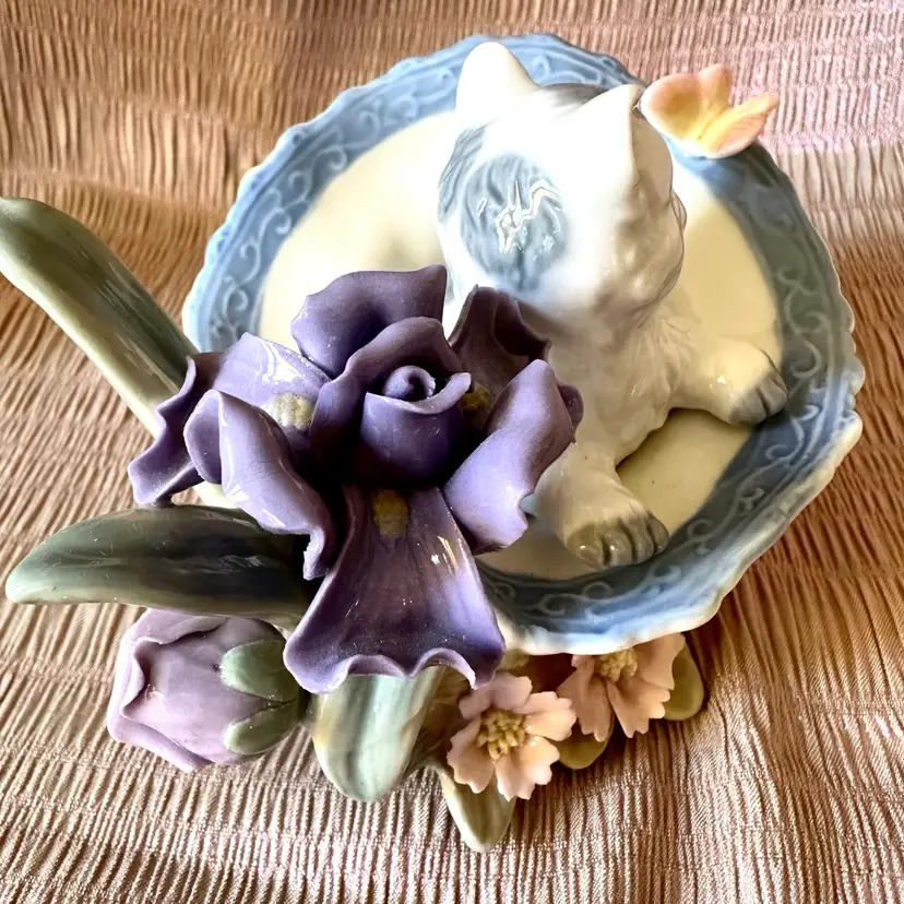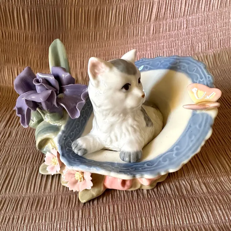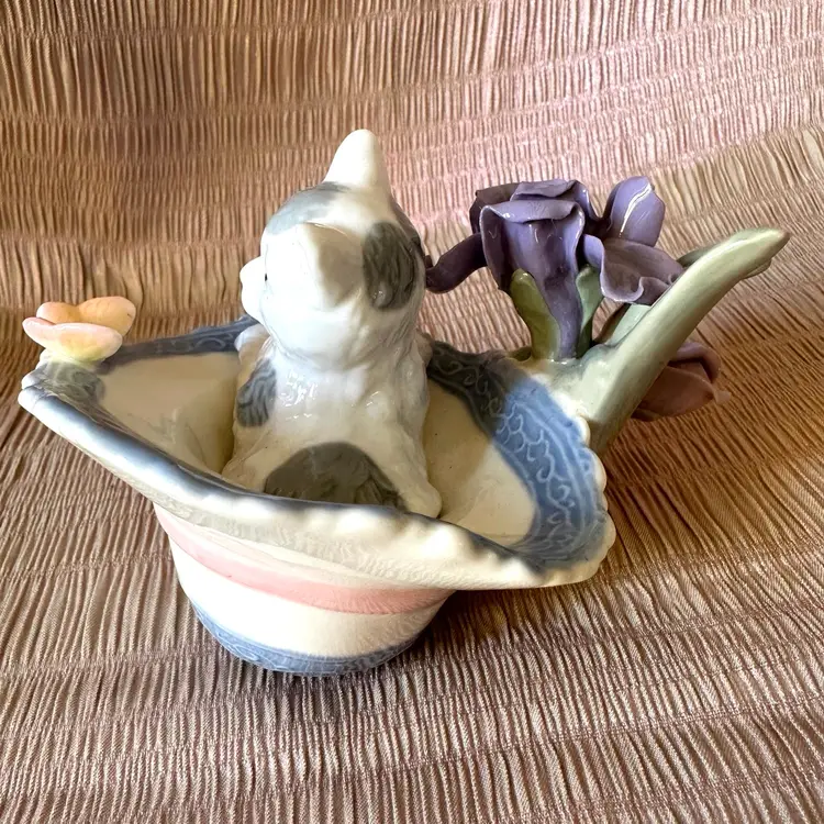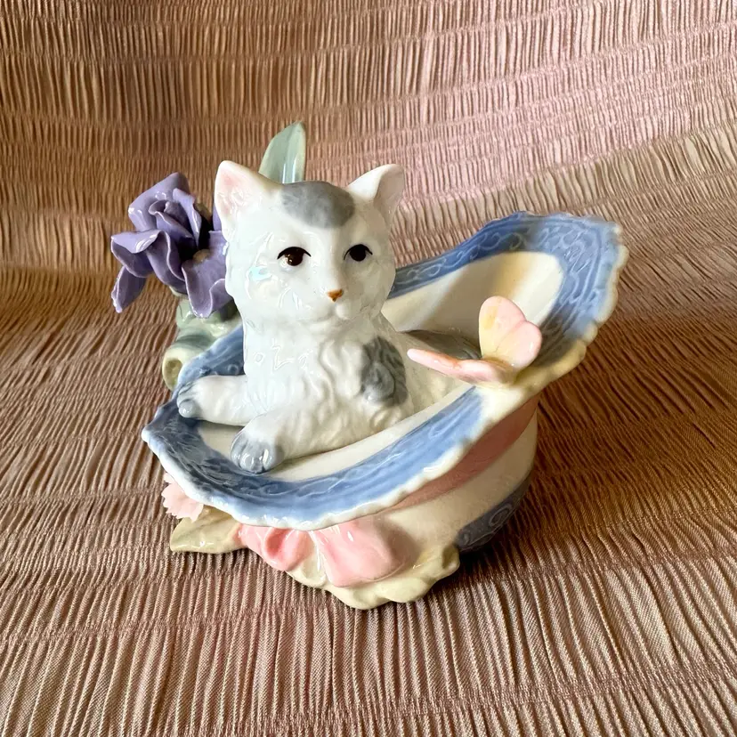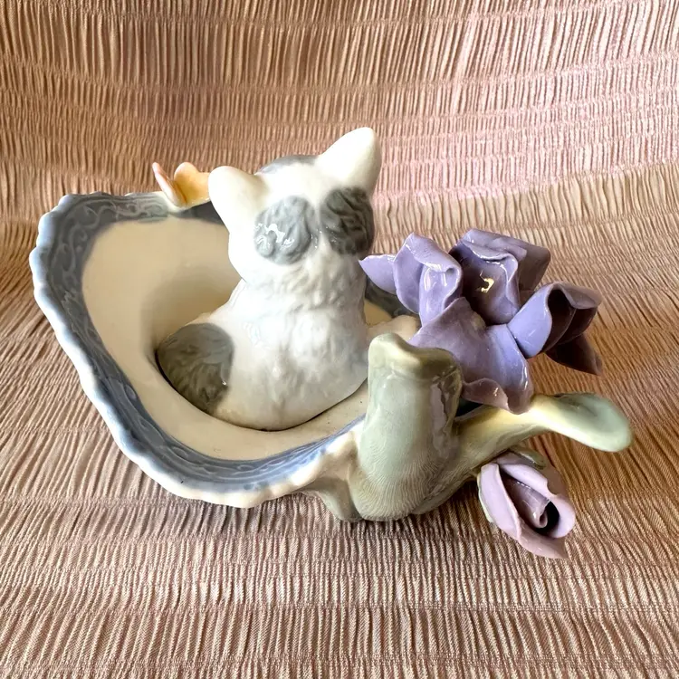 Vintage porcelain figurine cat with butterfly in a decorated basket amongst pink and lavender flowers. Kitty is grey and white. No chips or cracks. No signature remains of a label🍒