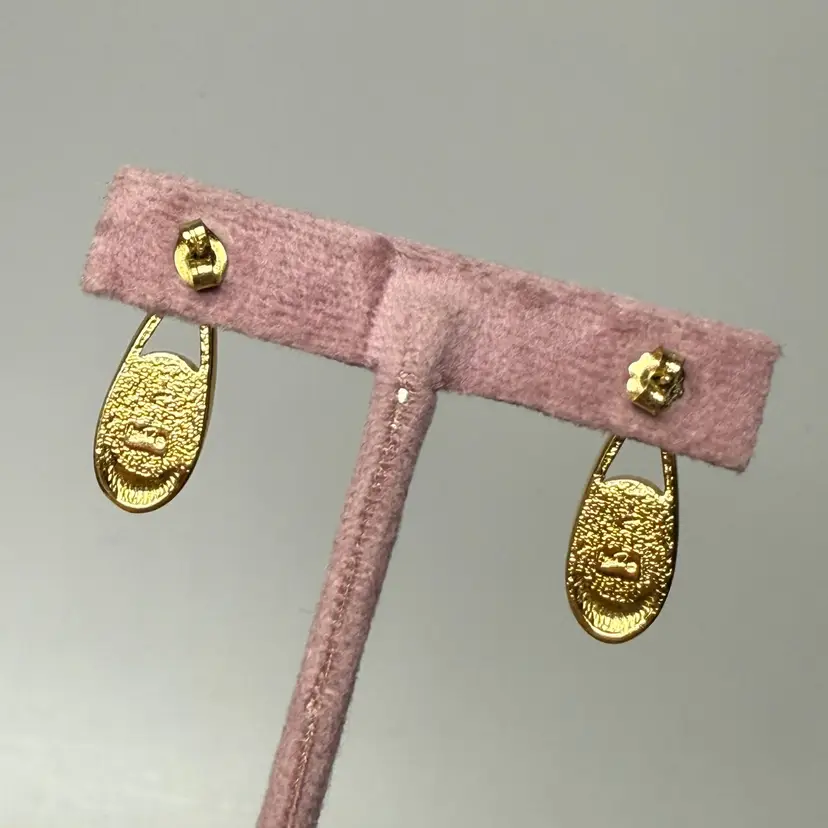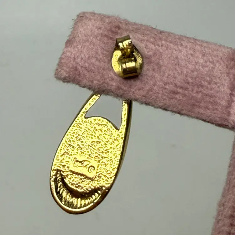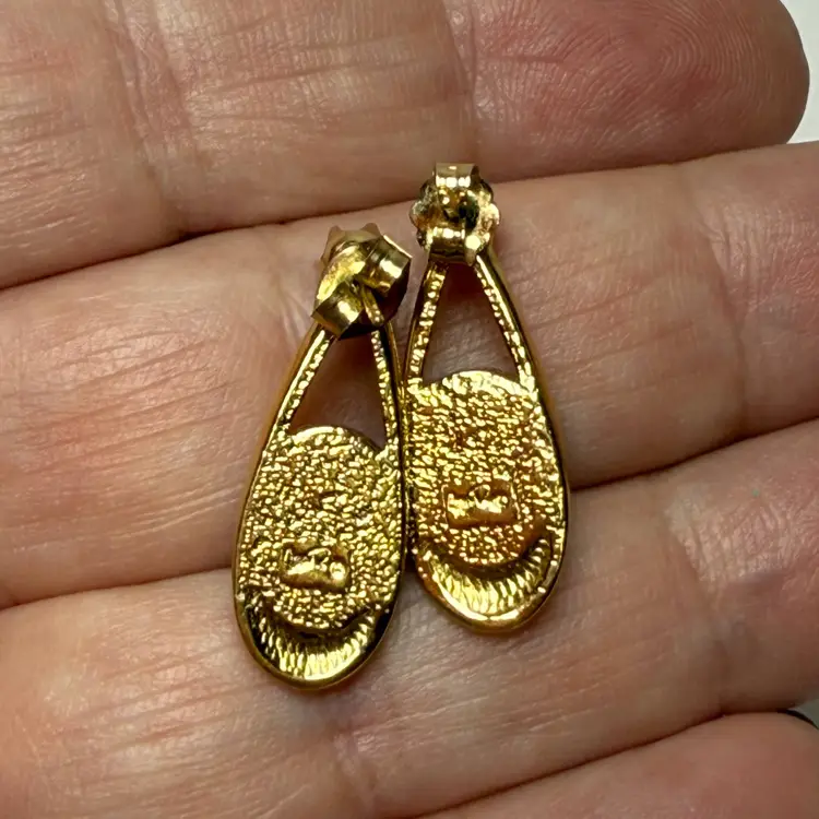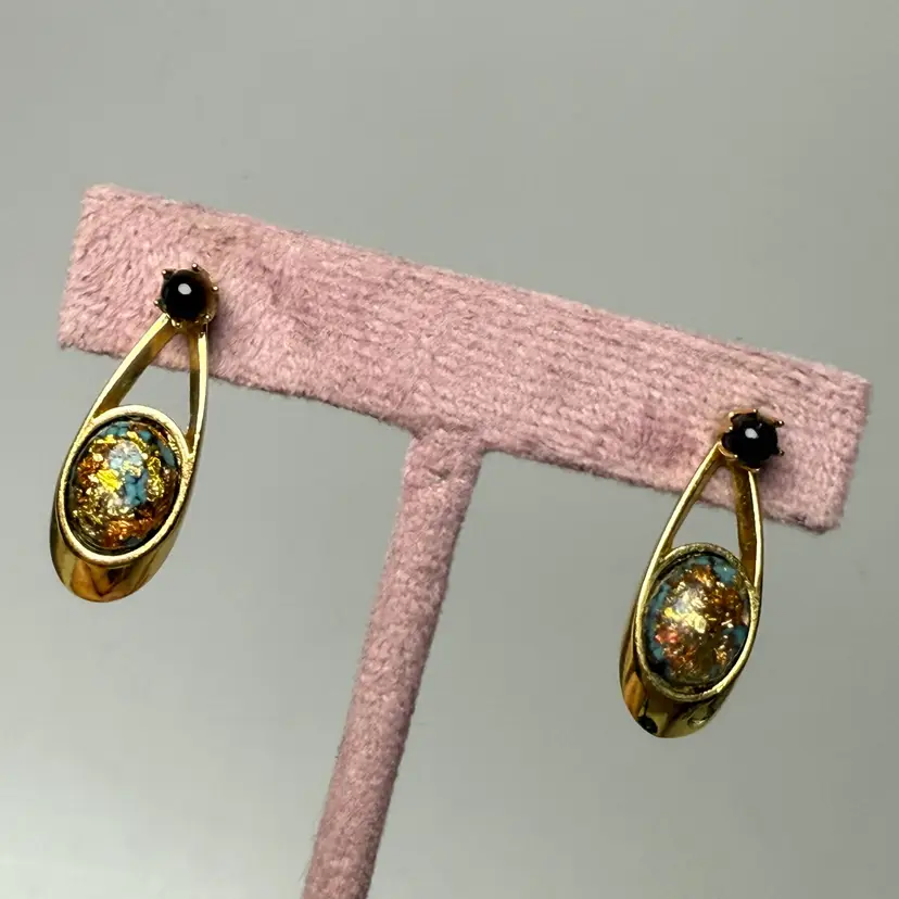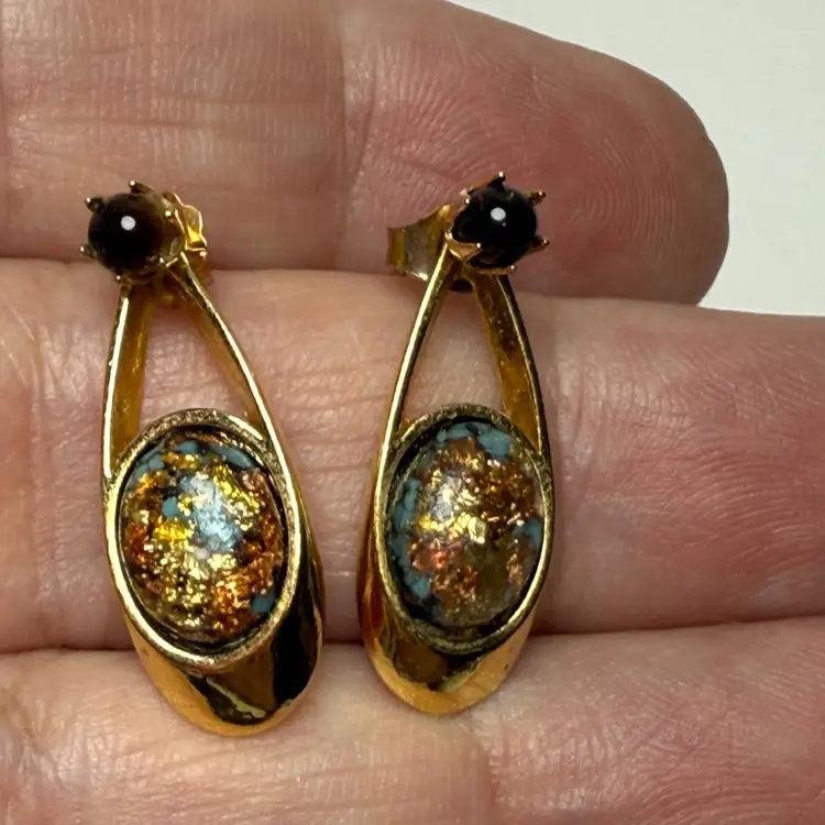 Vintage Rainbow Flake Turquoise Gold Tone Drop Earrings Cat's Eye Studs Signed. 1" long. The studs are brown cat's eye and can be worn with or without the dangle. Great condition. Signed on the back but I cannot make out mark.