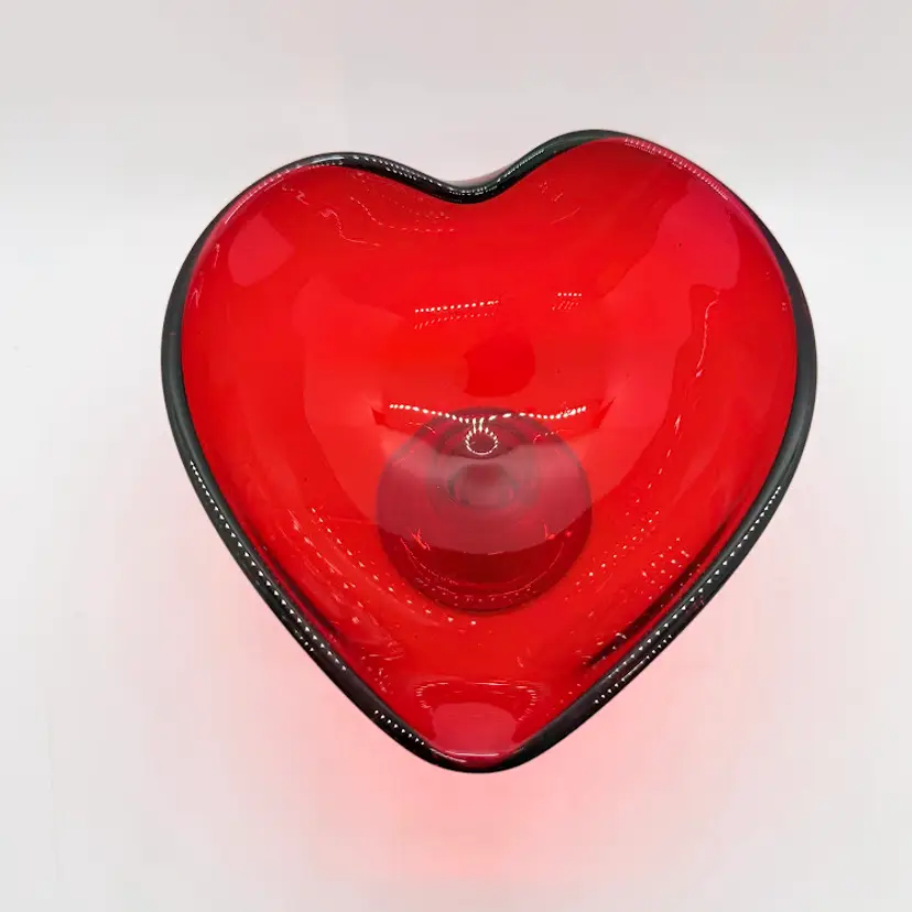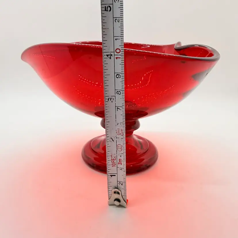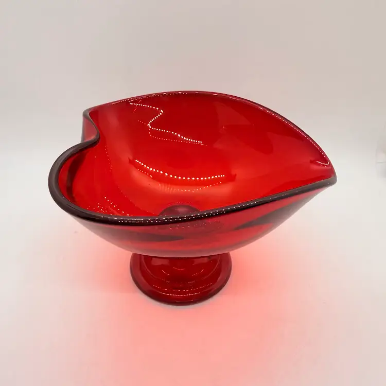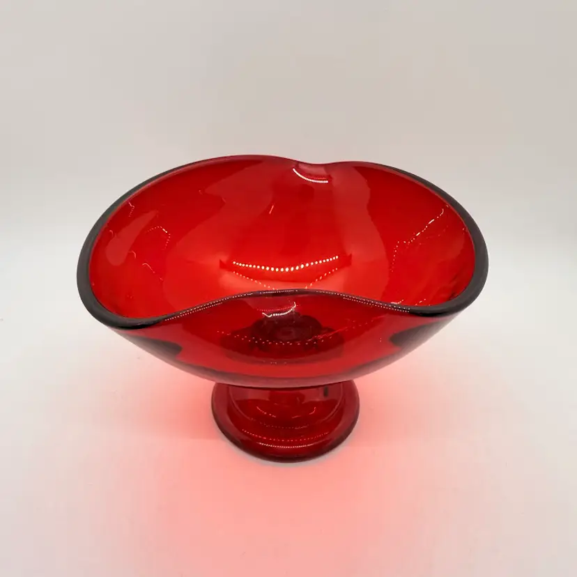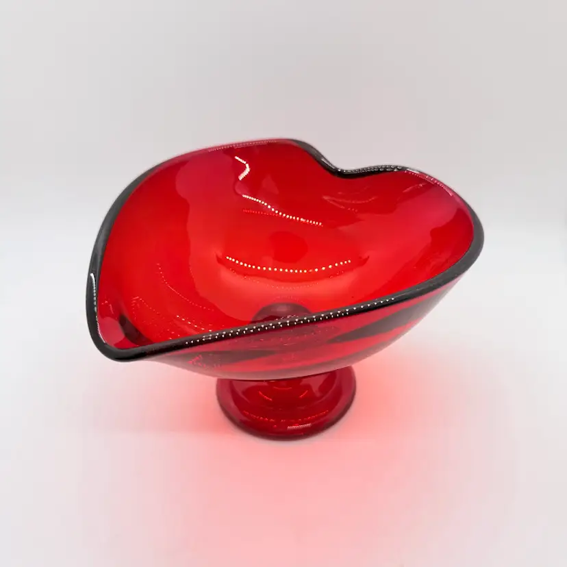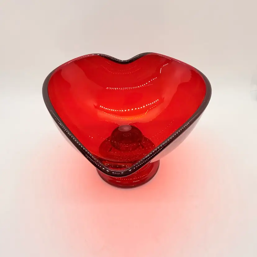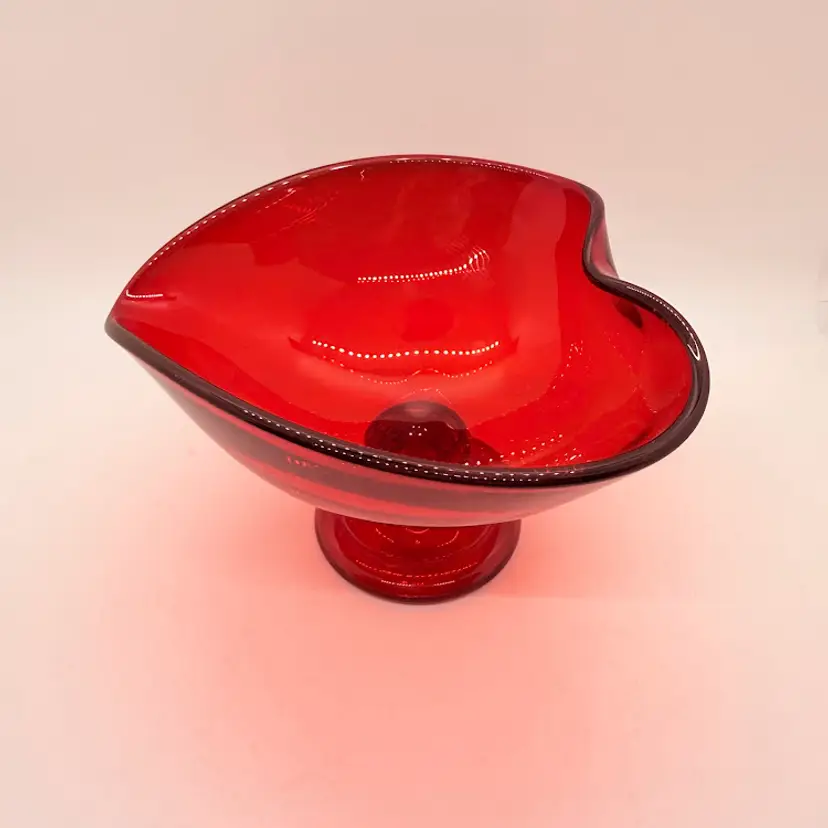 Vintage Red Heart Shaped Footed Compote/ Candy Dish/ Catchall/ Bowl by Fostoria Glass. Produced from 1964-1970. It has a faint orange UV glow inside the bowl part. No chips or cracks. Signs of light wear and use. Some bubbles in the glass from production. Please see pictures.