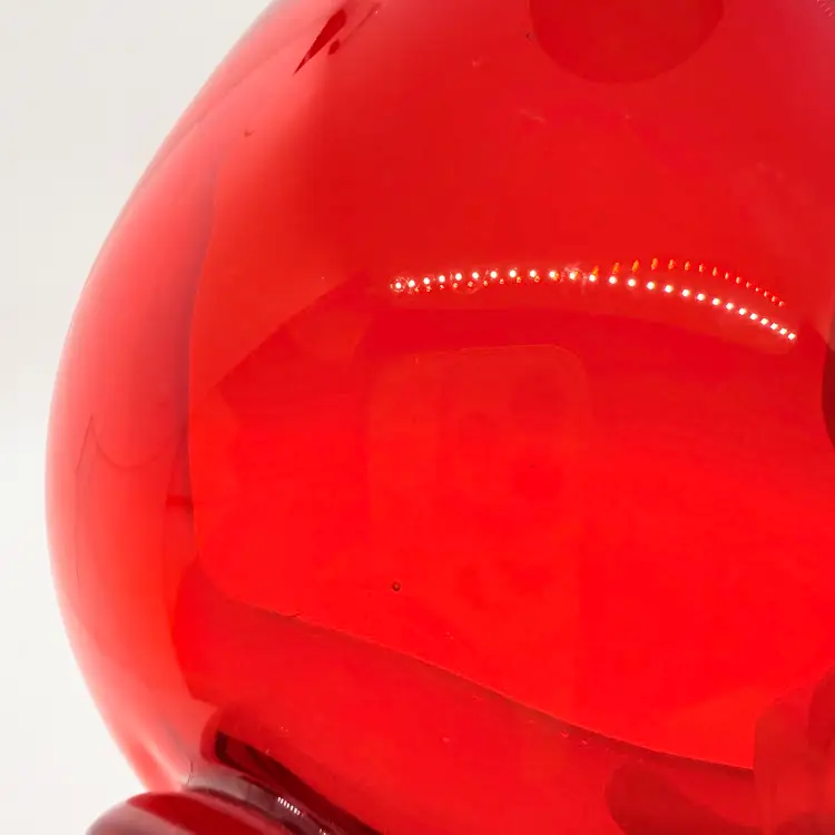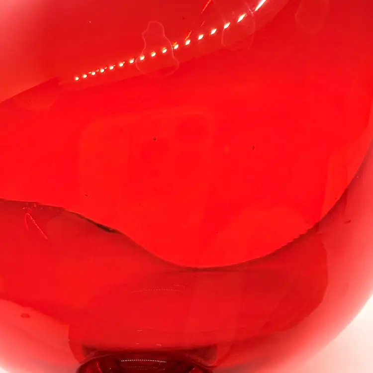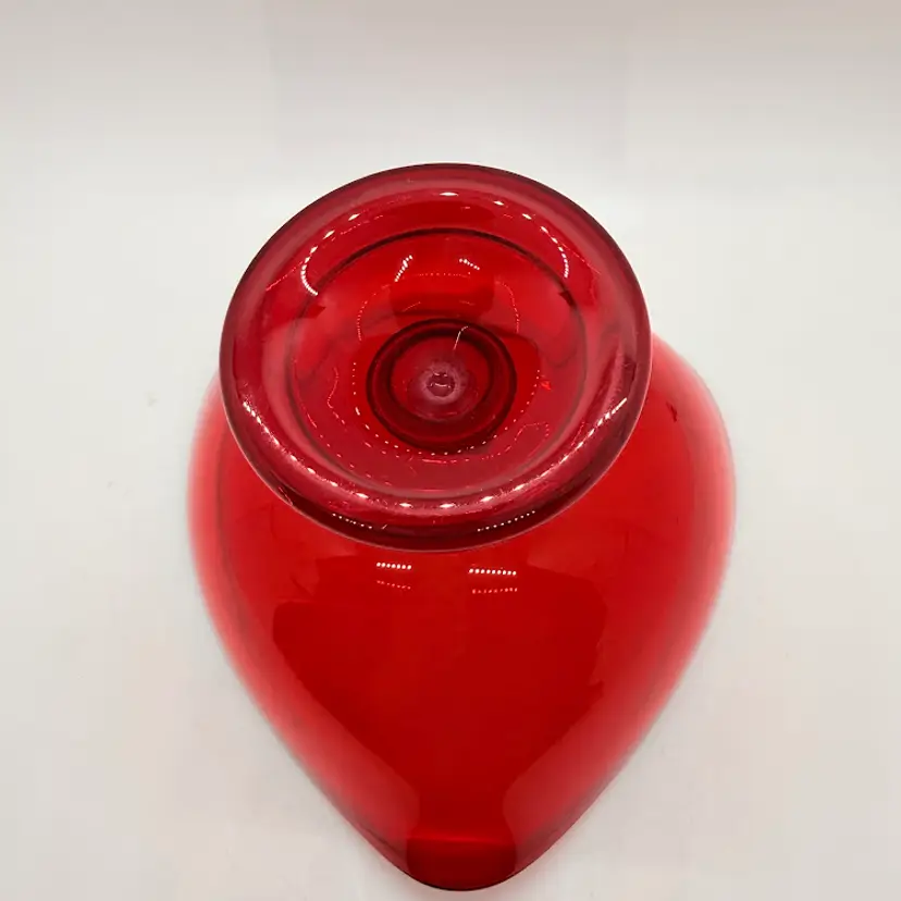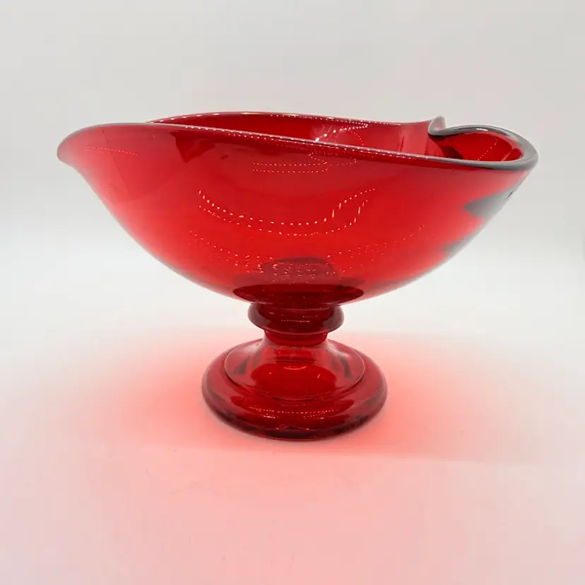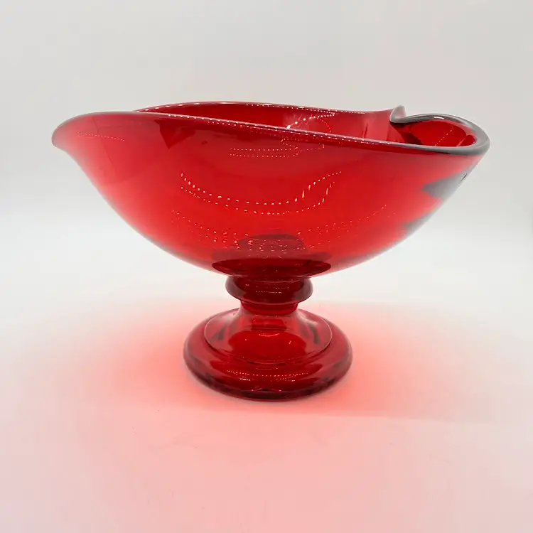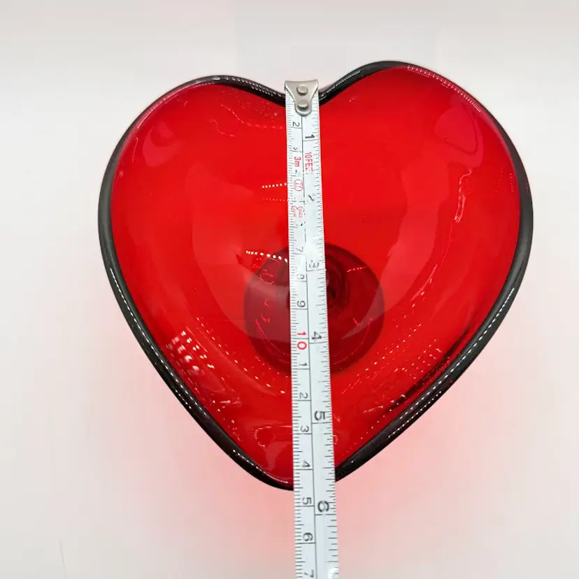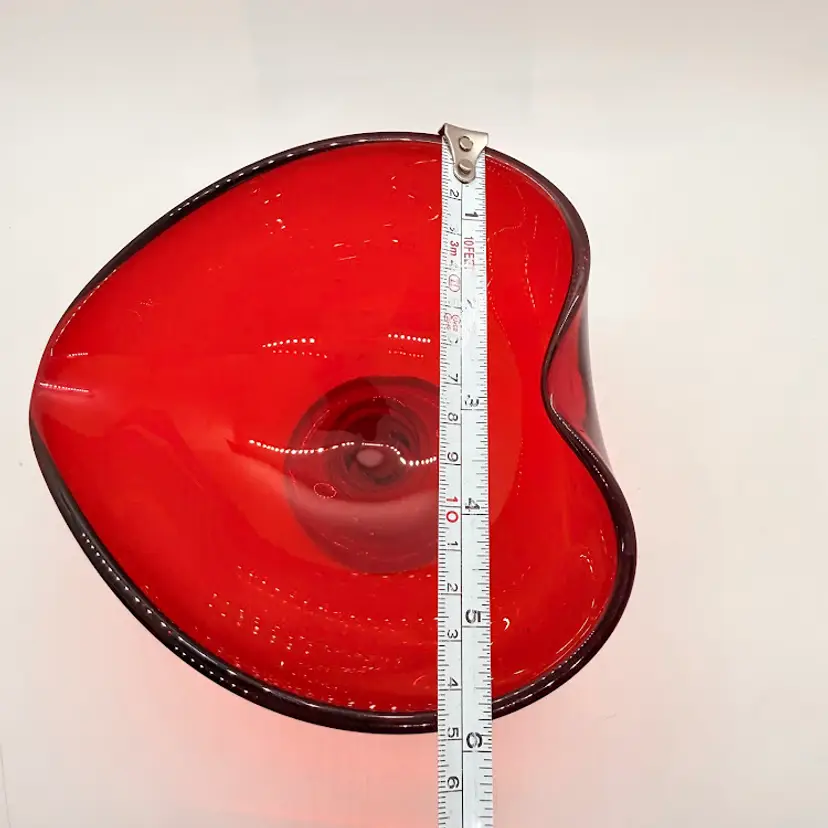 Vintage Red Heart Shaped Footed Compote/ Candy Dish/ Catchall/ Bowl by Fostoria Glass. Produced from 1964-1970. It has a faint orange UV glow inside the bowl part. No chips or cracks. Signs of light wear and use. Some bubbles in the glass from production. Please see pictures.