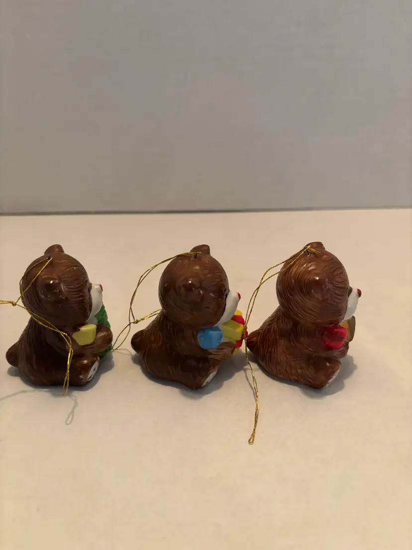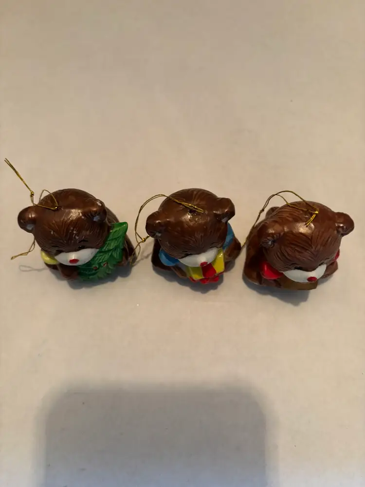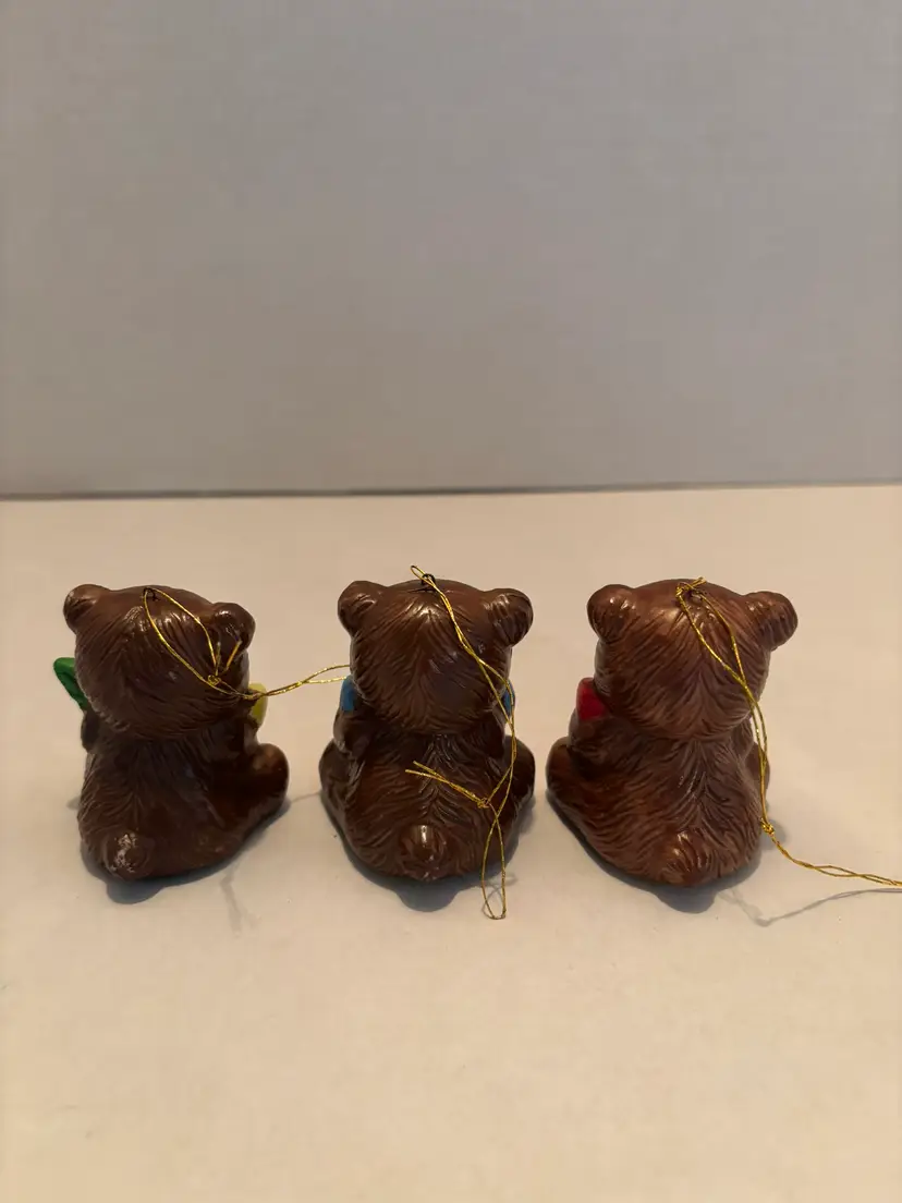 Vintage Set of 3 Porcelain Teddy Bear Christmas Ornaments Brown 2 inches Tall