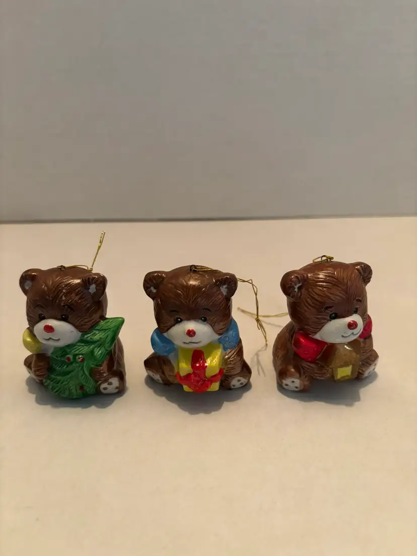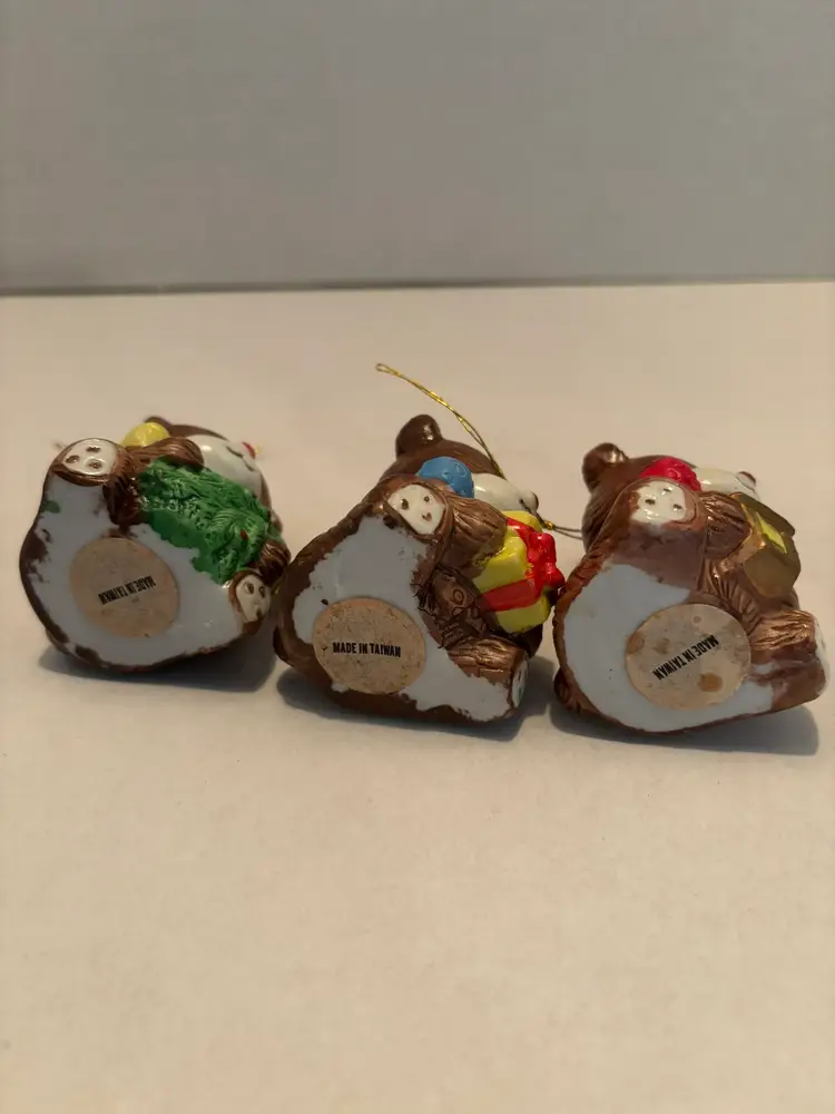 This vintage set of 3 porcelain teddy bear Christmas ornaments is a charming addition to any holiday decor collection. Standing at 2 inches tall, these brown teddy bears are a cozy and nostalgic choice for Christmas. Made in Taiwan, these collectible ornaments showcase a classic design that will warm up any holiday display with their vintage appeal. SOME SCRATCHES ARE PRESENT DUE TO AGE AND USE.