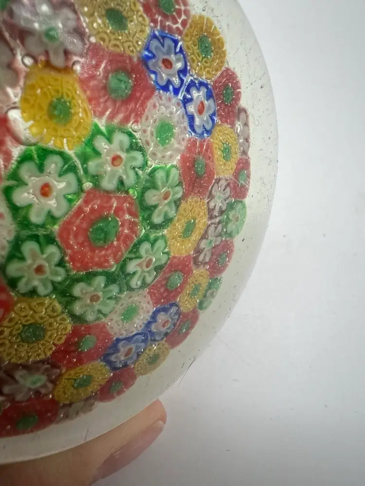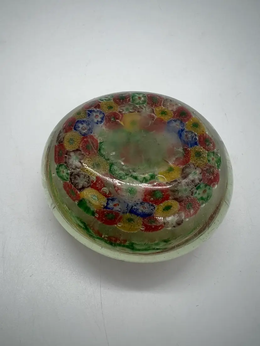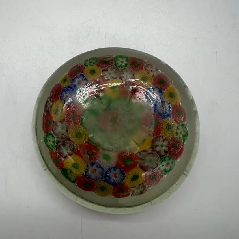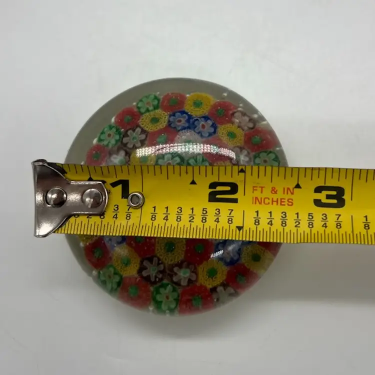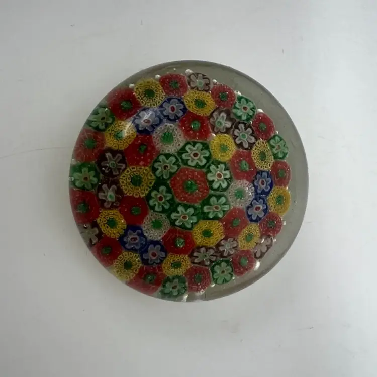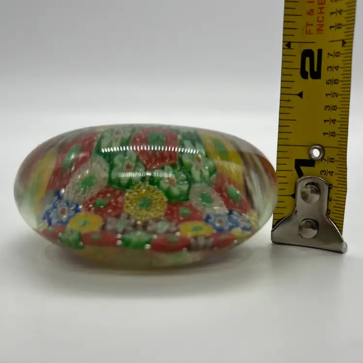 This vintage small Millefiori art glass paperweight measures 2.5 inches and features a red, yellow, blue, and green color scheme. Handmade in a Mid 20th Century production style, this decorative paperweight showcases a unique Millefiori pattern created through blown glass technique. The brand is unmarked, adding to its vintage appeal for collectors of decorative pottery and glassware. Excellent condition. No chips or cracks.