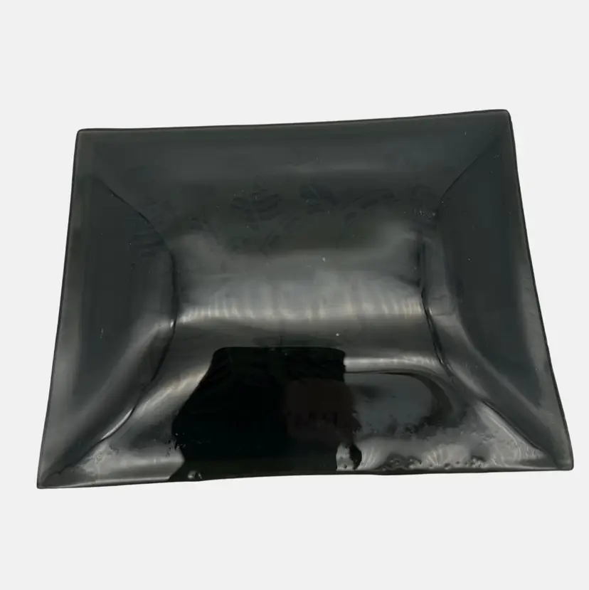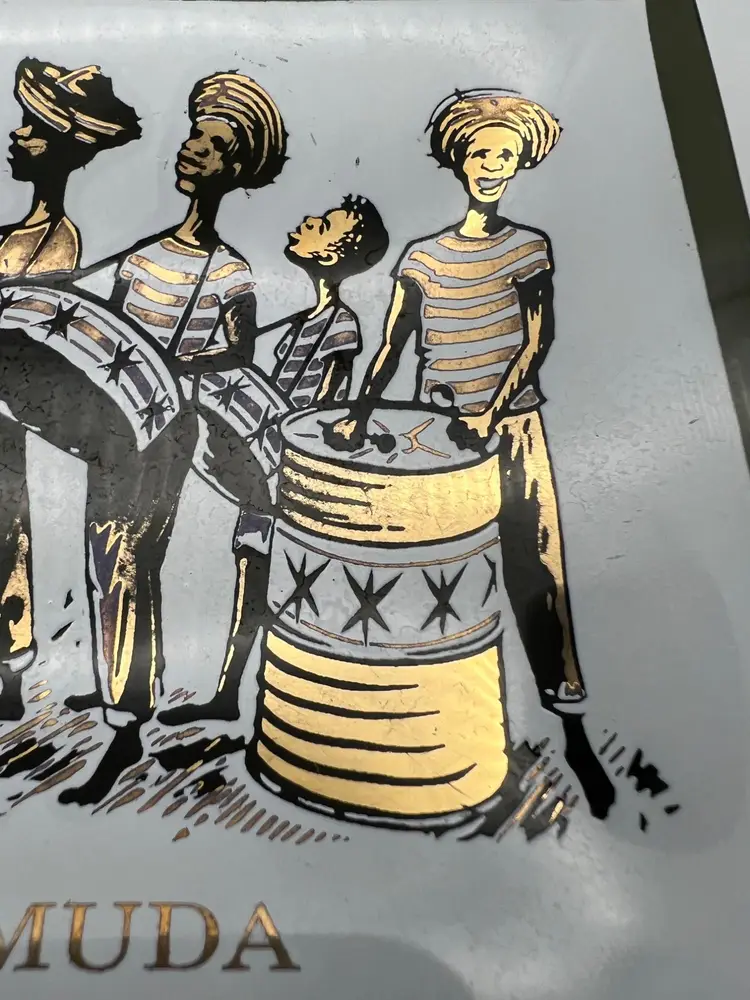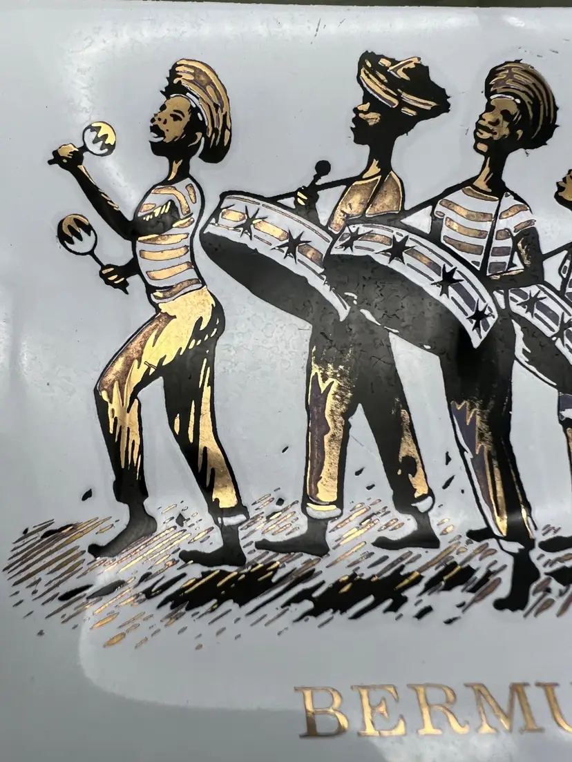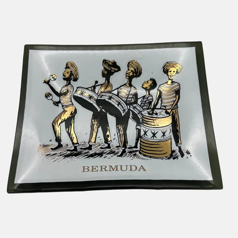 This vintage Bermuda trinket dish made from smoked glass has a design featuring musicians. Ideal for holding small jewelry or keys. The trinket dish measures 4.75" x 3.75".