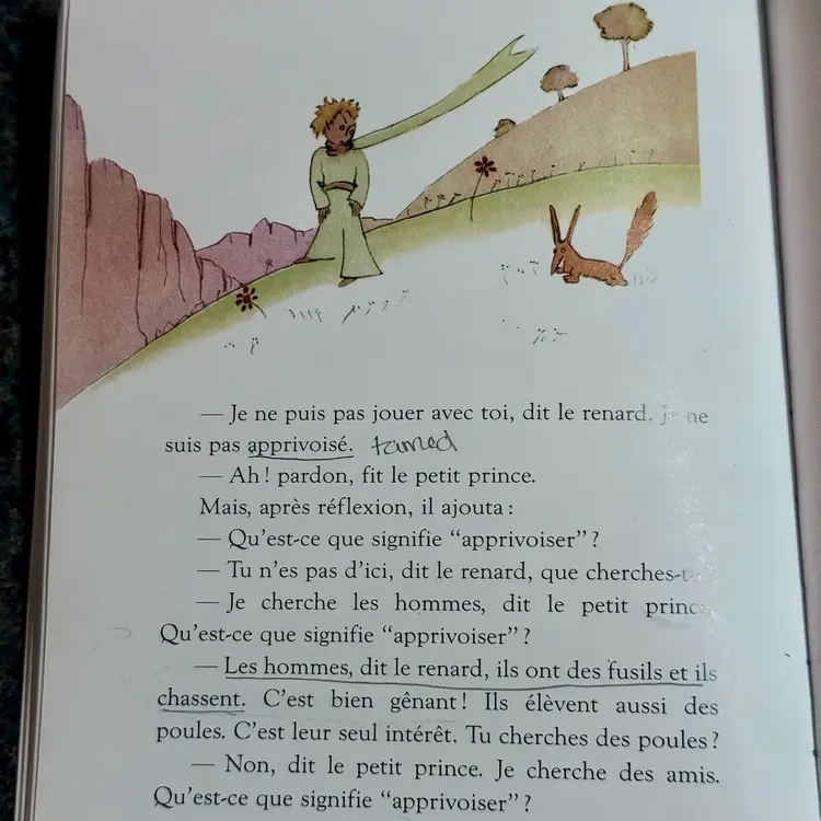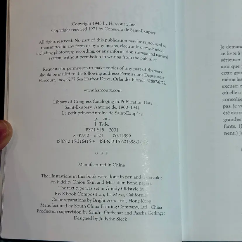 Approx 8” x 5.25”; written by Antoine De Saint-Exupéry; 2001 printing; 85pp; good condition (some underlining and notations throughout).