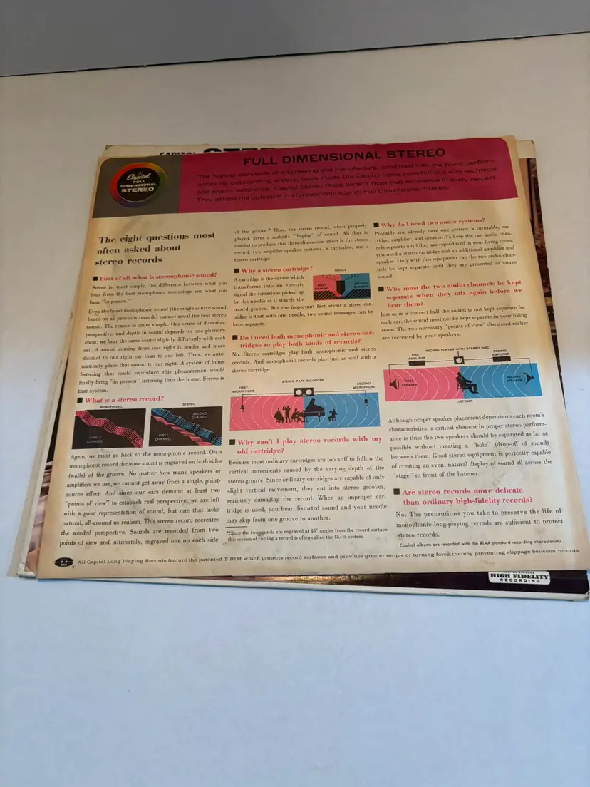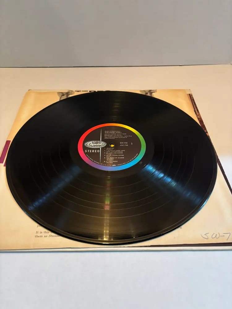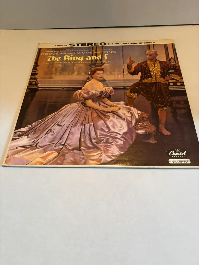 The product is a vintage vinyl record of Rodgers and Hammerstein's "The King and I" released in 1956 by Capitol Records. This LP comes in a cardboard sleeve and is a classic piece of music history. Perfect for fans of musical soundtracks and collectors of vintage vinyl records, this item offers a nostalgic listening experience with the iconic music of Rogers and Hammerstein. THERE IS A TORN EDGE TO THE COVER. SEE PICTURES