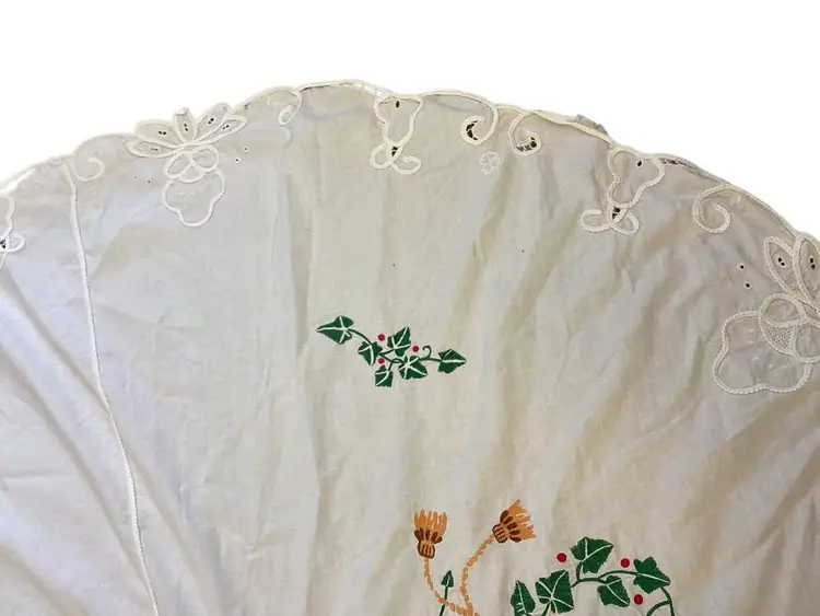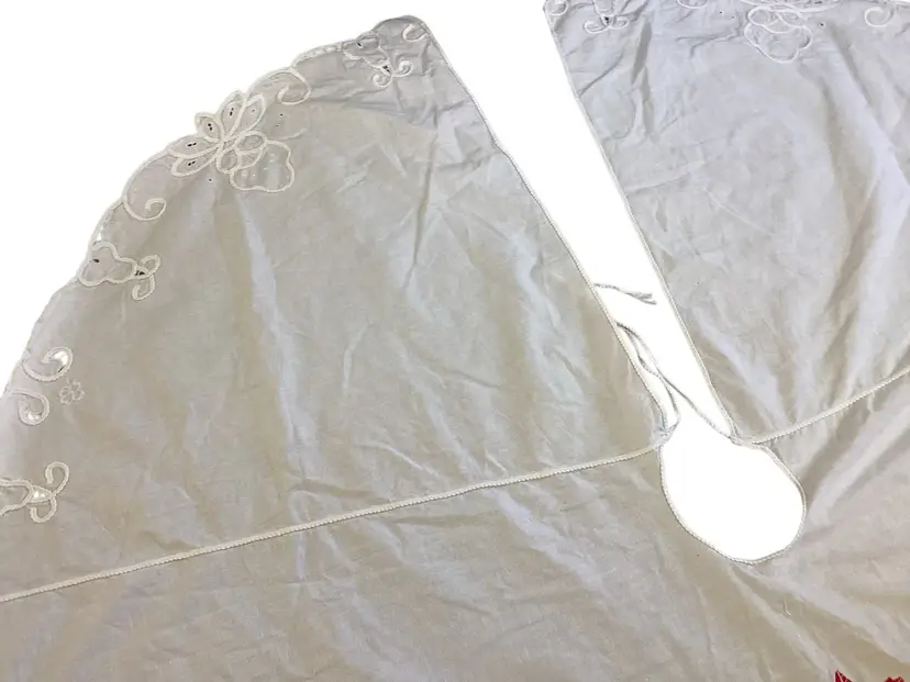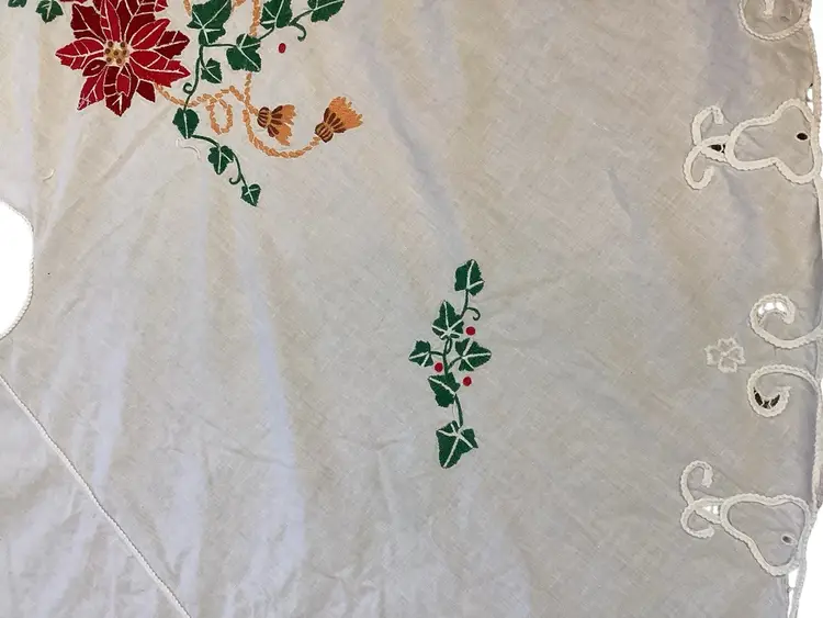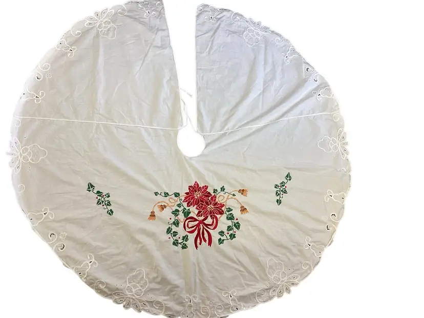 This Vintage White Hand Embroidered Poinsettia & Holly Christmas Tree Skirt is a handmade, large-sized decoration perfect for the Christmas season. Made from a combination of polyester and cotton, this tree skirt features intricate hand embroidery of poinsettia and holly designs in a classic white color. Add a touch of vintage charm to your holiday décor with this beautifully crafted piece that will serve as a stylish addition to your Christmas tree for years to come. 47”