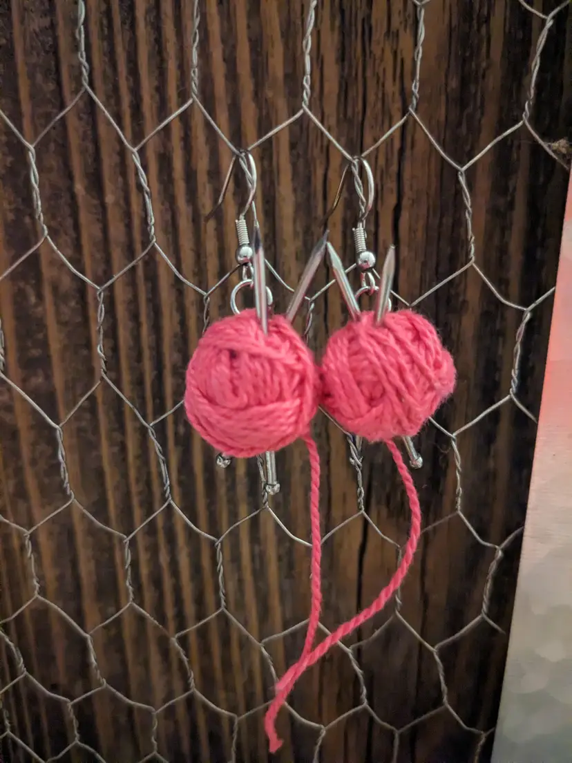 Cute little yarn ball earrings with mini knitting needles. Stainless steel fishhook earrings.